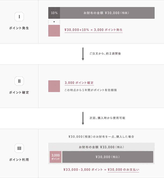 30,000円(税抜)のお財布を一点購入した場合。