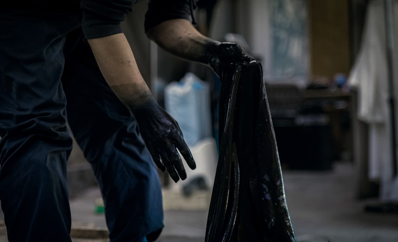はじめに植物の「藍」の葉を発酵させた染料「蒅(すくも)」を作る工程から始まります。「藍師」と呼ばれる職人が夏に藍の葉を刈り取り乾燥し、秋に「寝せ込み」という発酵作業をおこないます。5日~1週間に1度の頻度で水をかけながらかき混ぜて、70~80℃の温度を保ちながら発酵を進め、100日間かけて「すくも」をつくります。