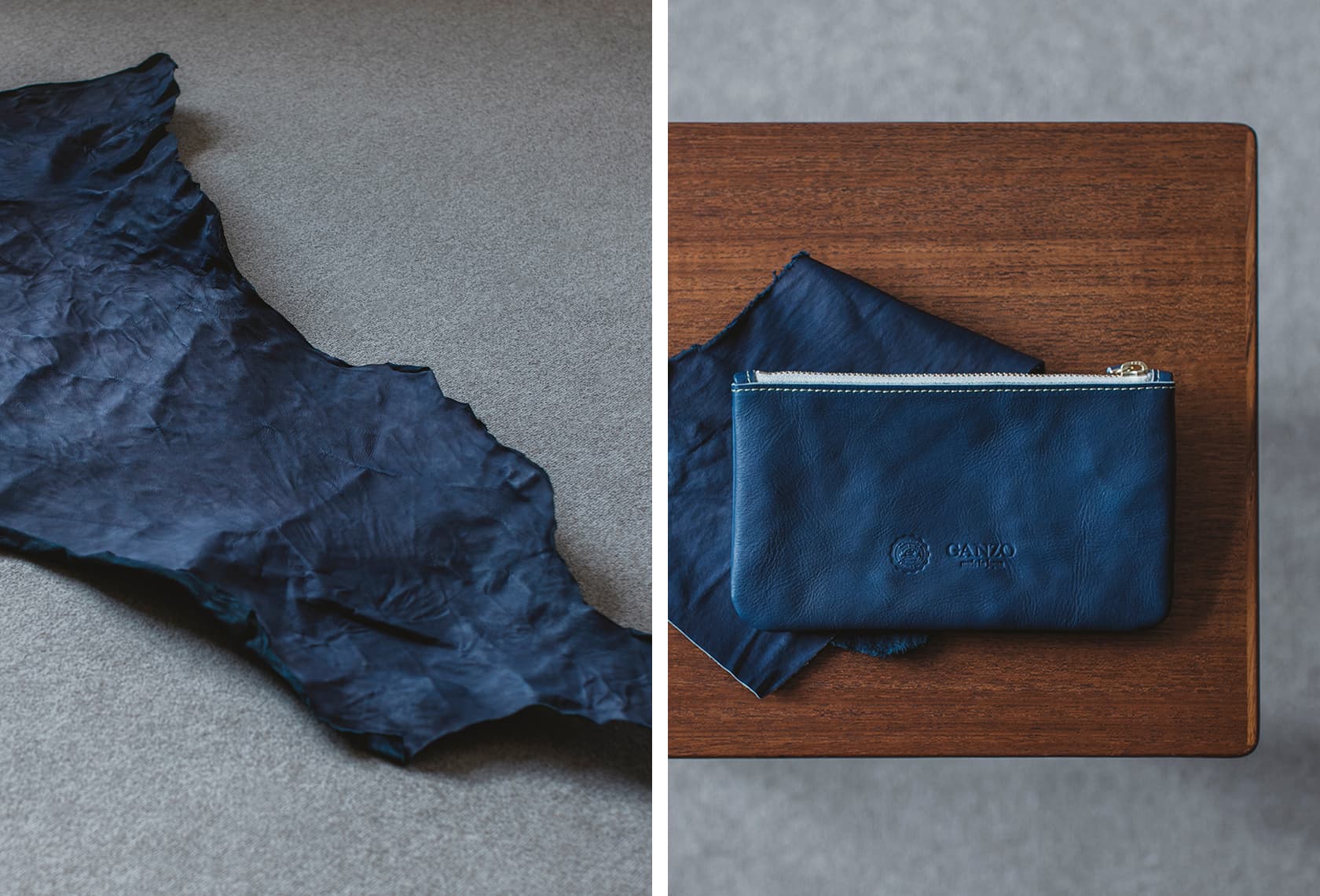 クラスト自体も一枚一枚個体差があり同じ藍色に合わせるのが難しいのですが、堀尾氏は出来るだけ布を染める感覚で染めていくことにこだわったと言います。完成した藍染の革は柔らかさを保ちながら発色のよい綺麗な蒼に染まり、その色合いは風合いと共に完成度の高い仕上がりとなりました。