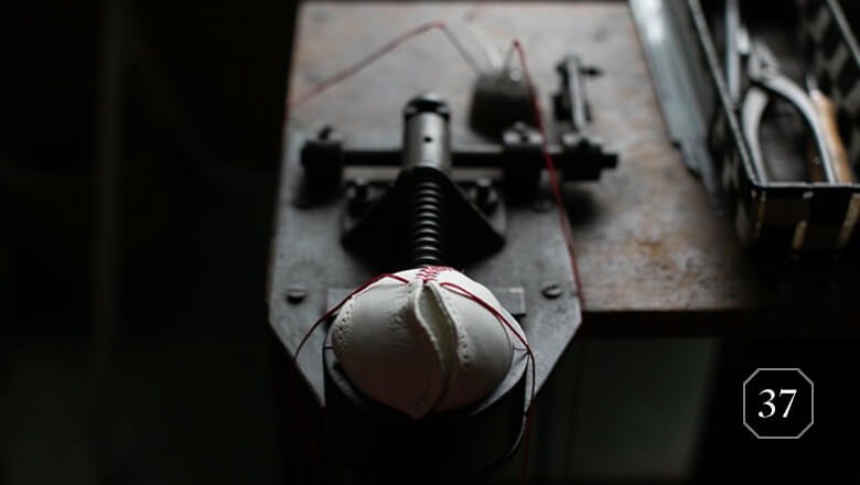 糸は3回に分けて巻かれていきます。まずは芯に太いウールを巻くところから始まります。そうすることで2つ目のウールを巻き進めていく中で核となる芯が正しく中心を保てるようになるのです。そして最後に綿糸を巻くことでボールの表面の凹凸をなくしていきます。重いウールを使えば重さ規定に沿うようにややふわりと巻かれ、柔らかくて軽いウールを使えば硬く頑丈に巻く。それはボールの飛距離にも影響し、硬く頑丈に巻かれたボールはよりよく飛ぶボールになるのです。