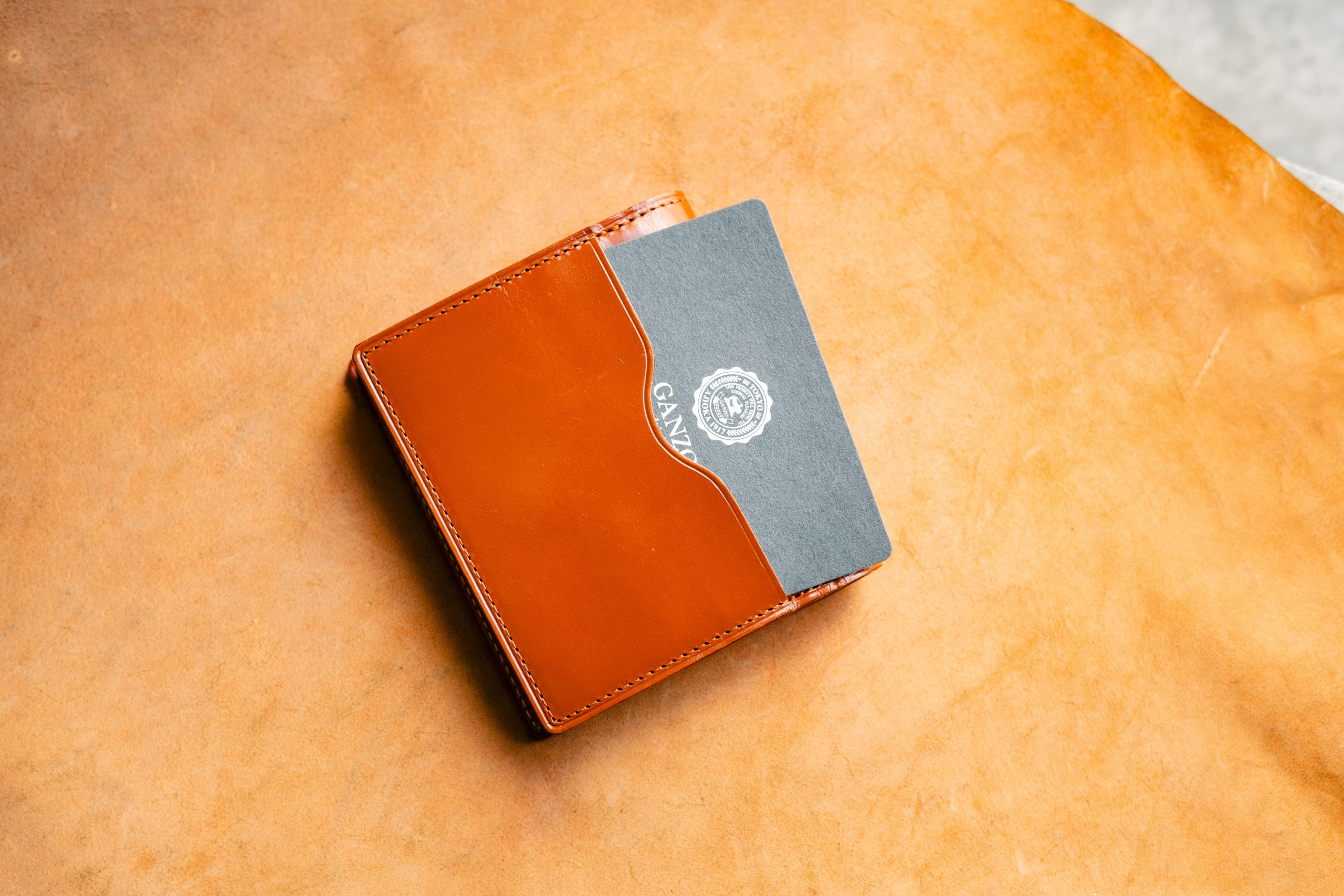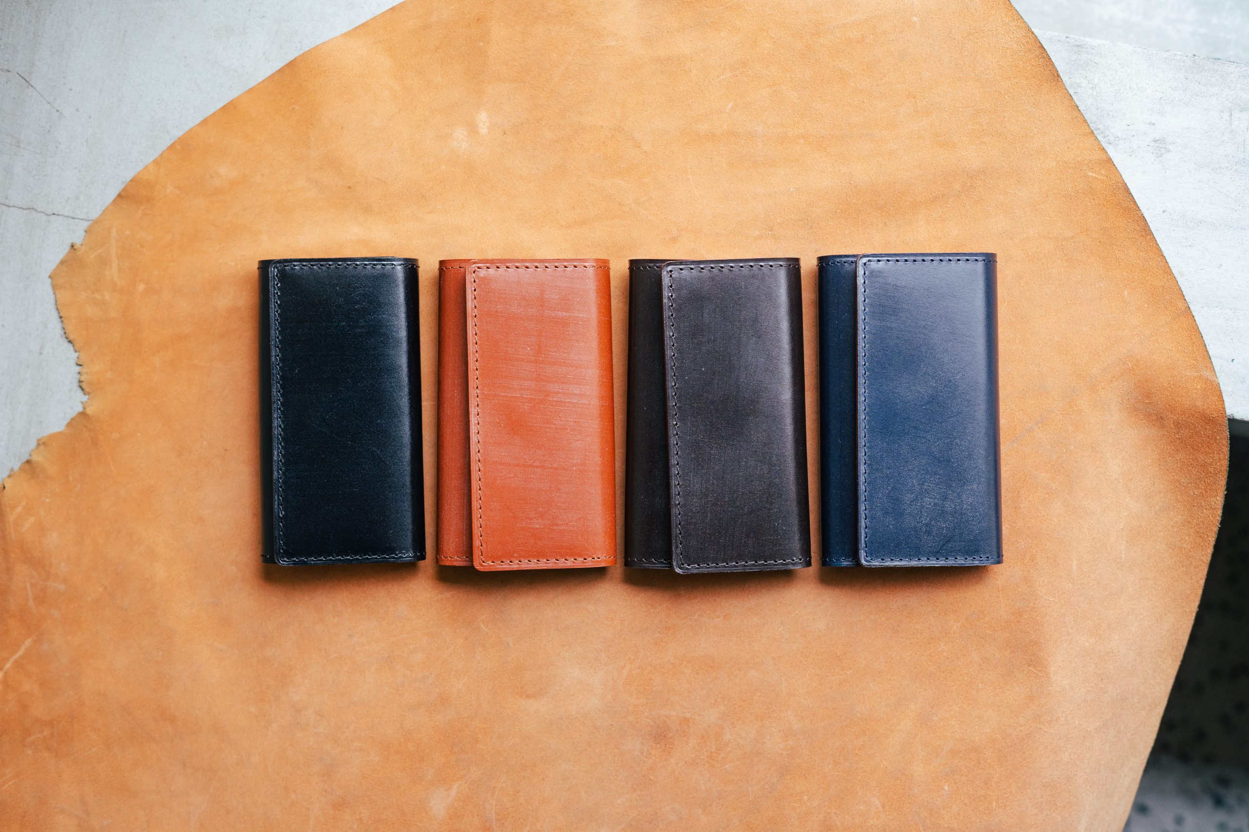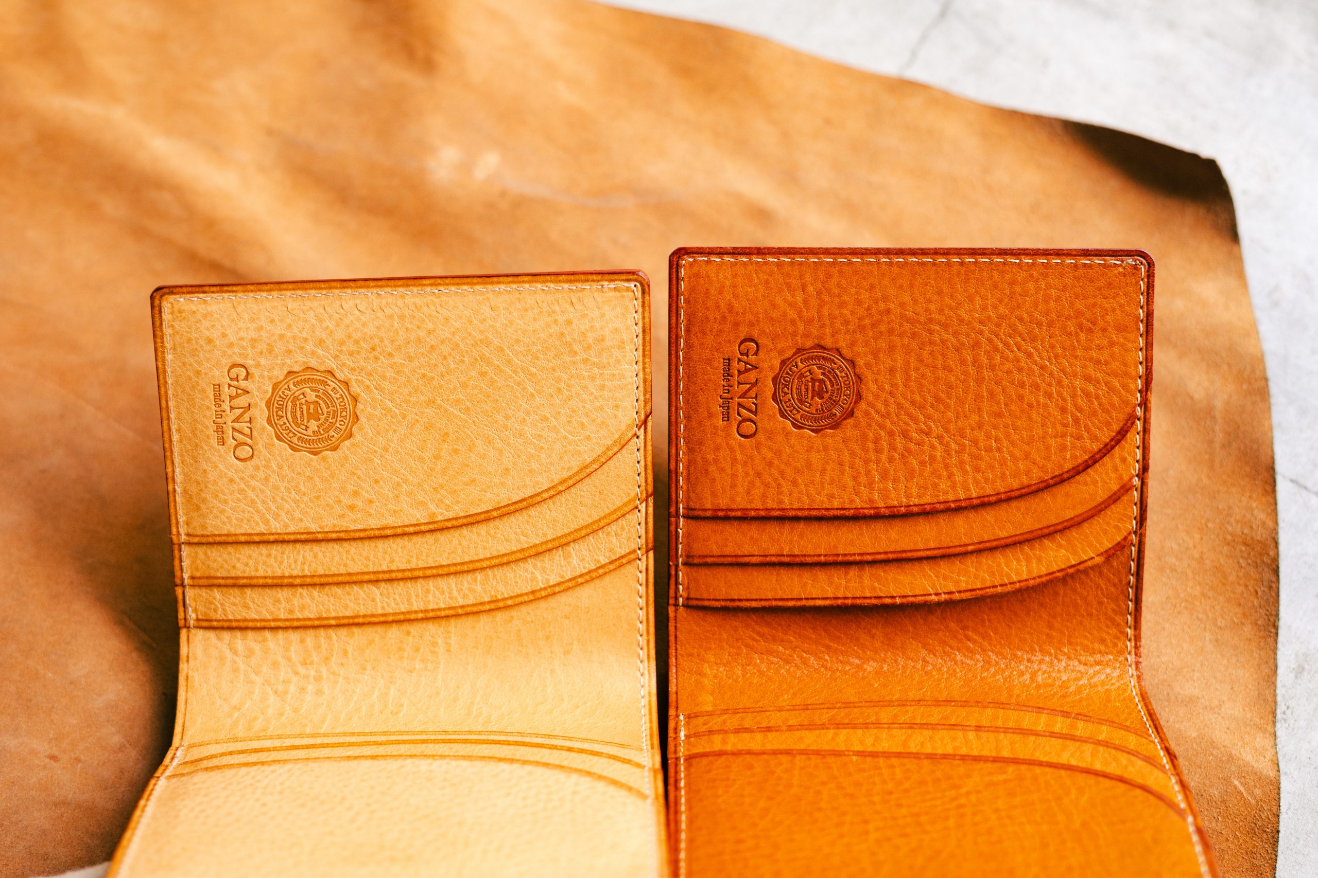 最初は左にあるものみたいに明るい色なんですが、使うにつれて徐々に、ほど良い焼けた革小物らしい色に変わっていきます。