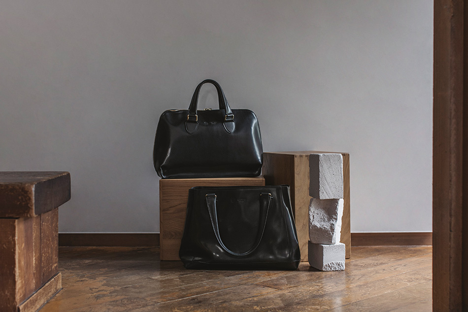 新作バッグは、革のコシを最大限に生かしシンプルに切目でまとめました。