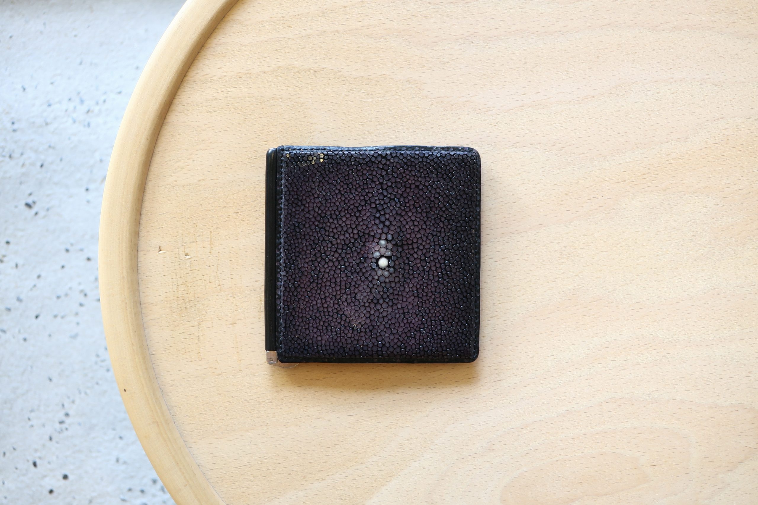 スティングレイ(エイ革)の表面は人間の歯と同じ『リン酸カルシウム』で、ミシン針も折れやすいなど加工が難しく、職人泣かせの素材です。