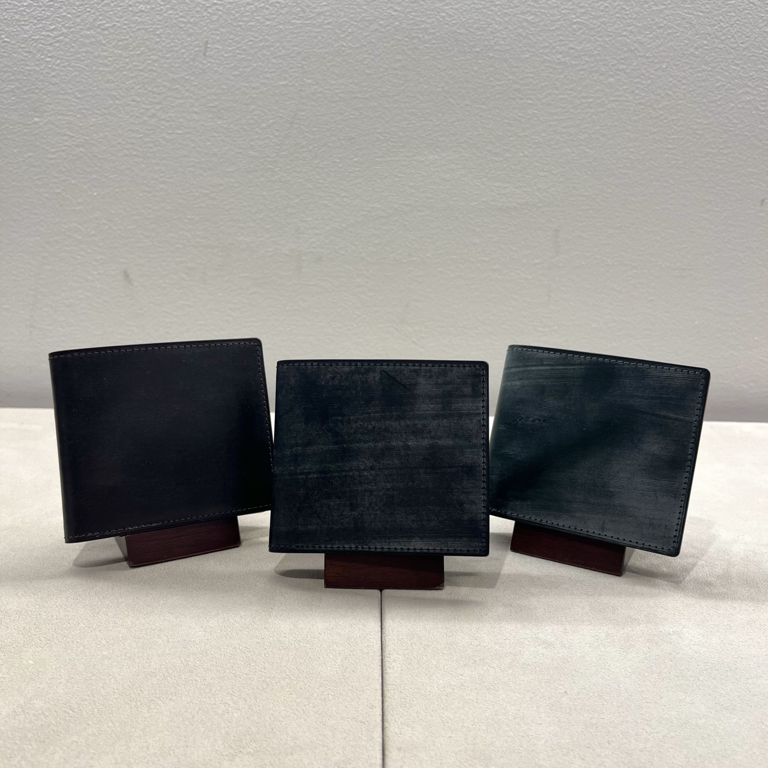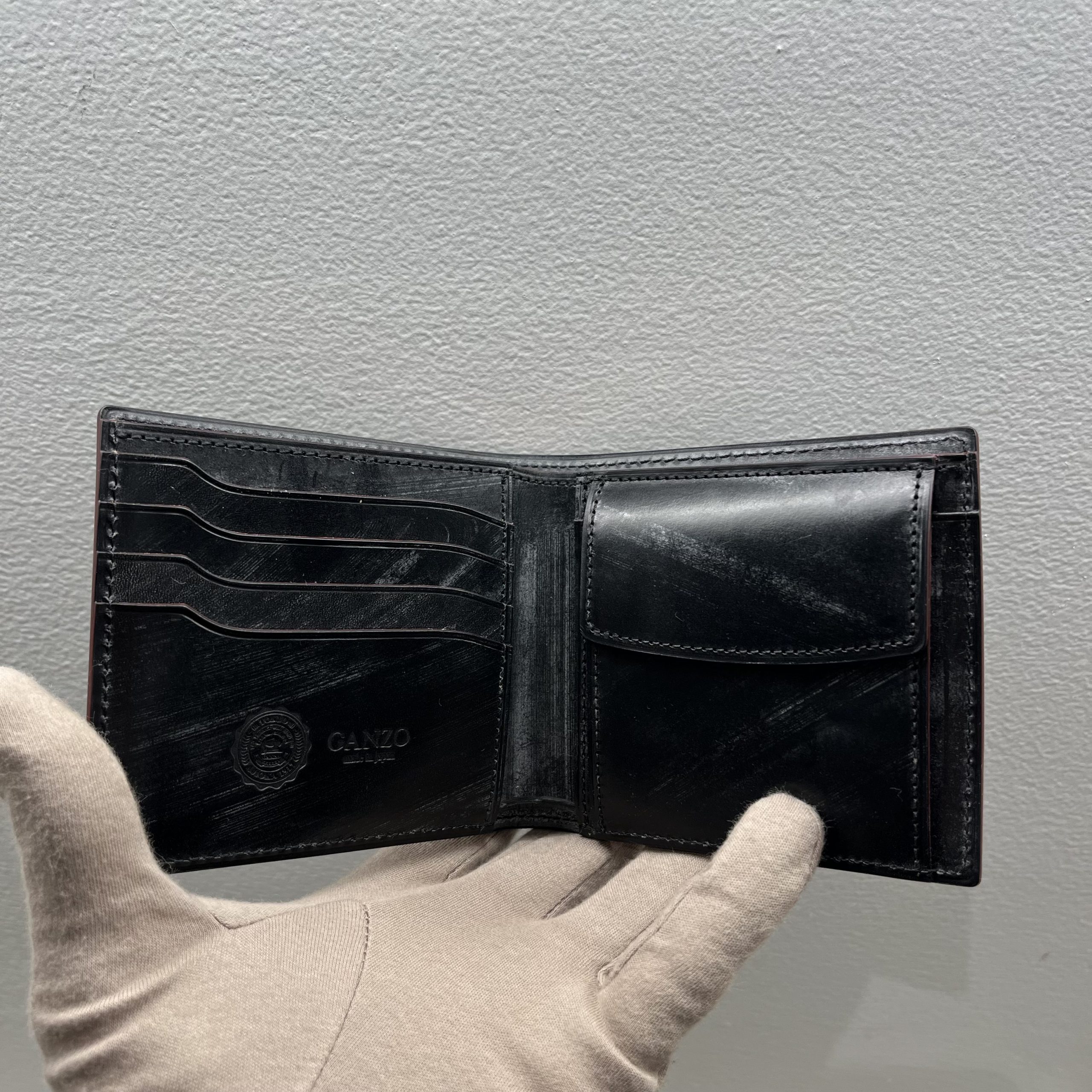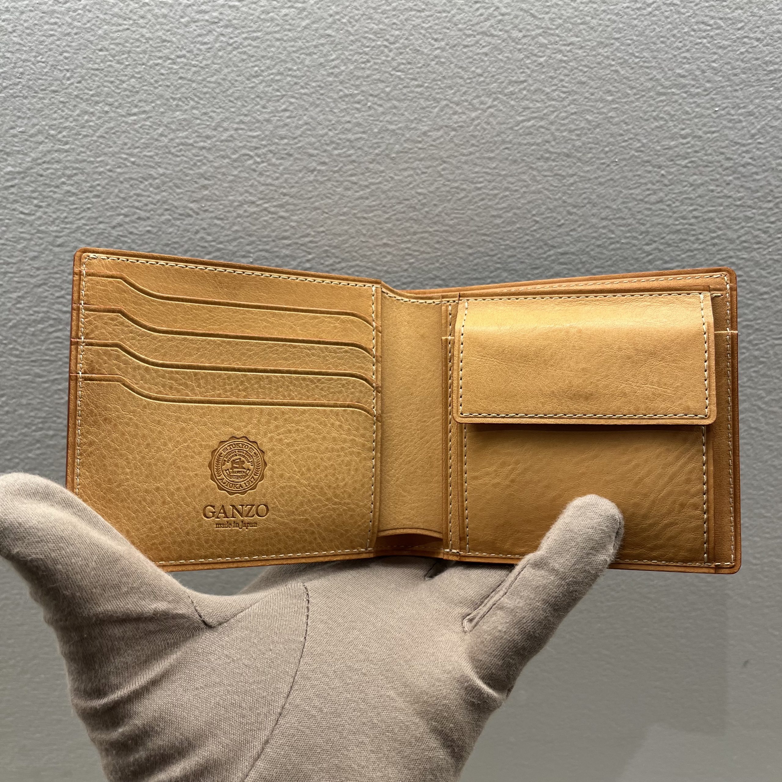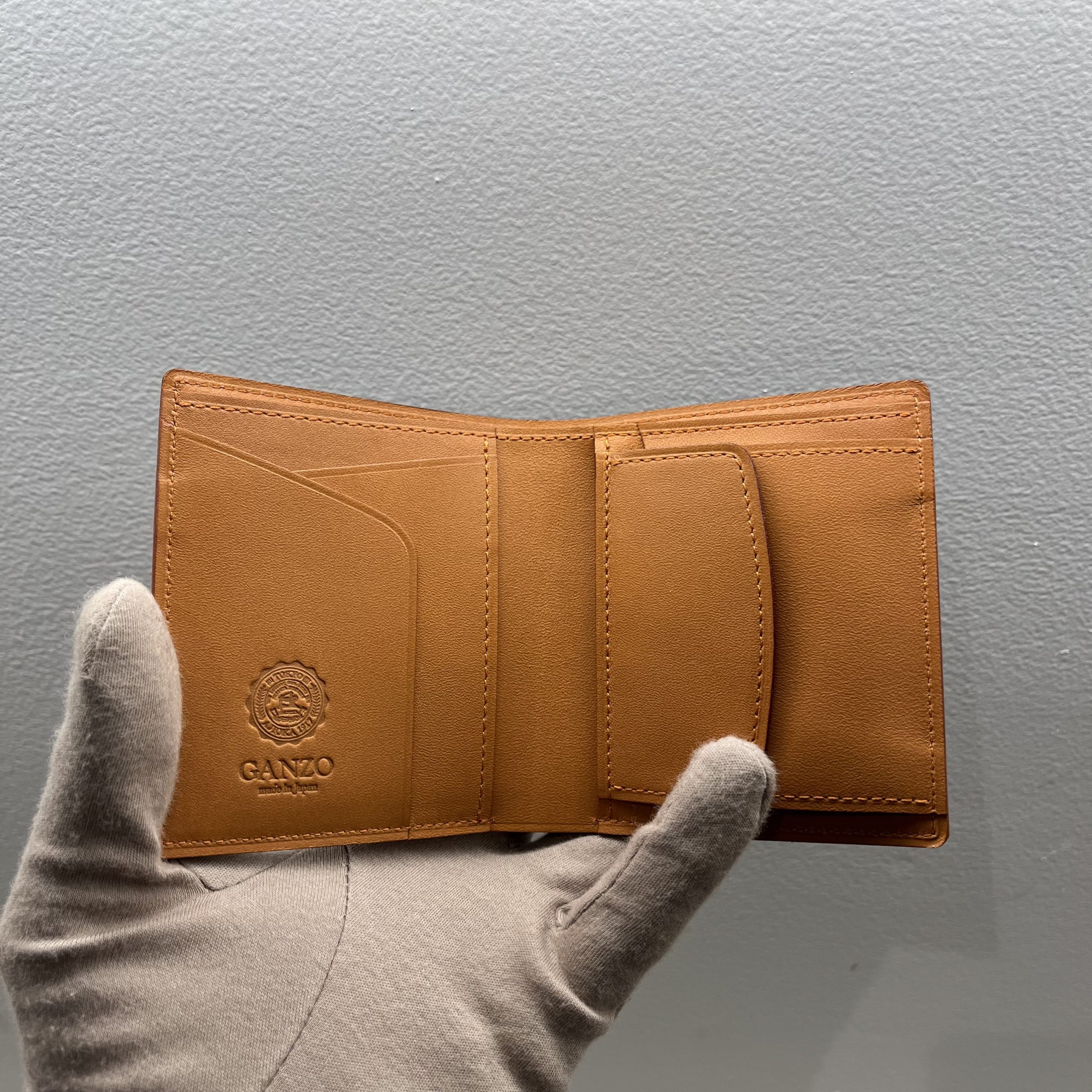 GANZOの定番二つ折り財布。贅沢に外装内装にダイドスルー(芯通し)ブライドルレザーを使用。財布の折れや曲がりにも柔軟に対応し、