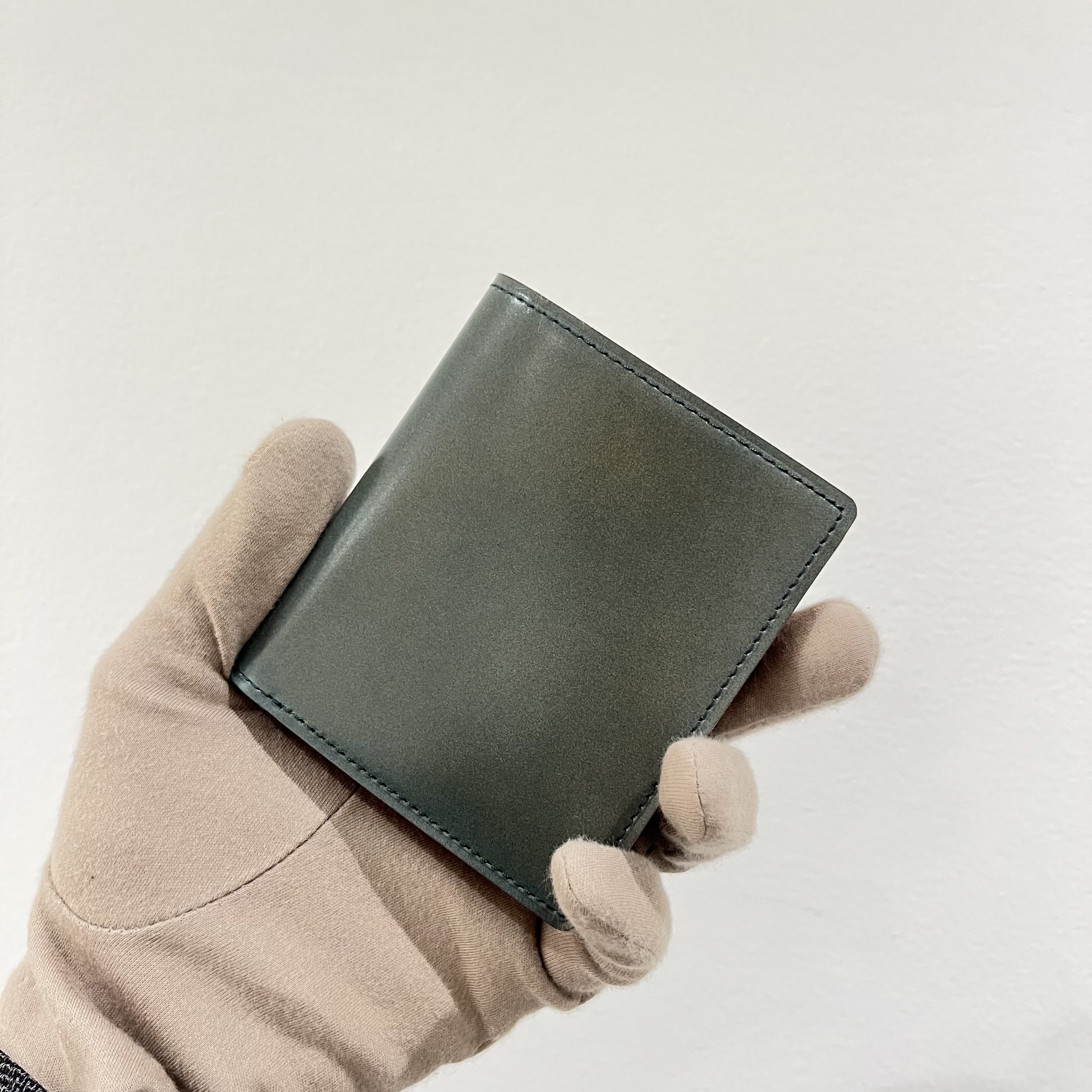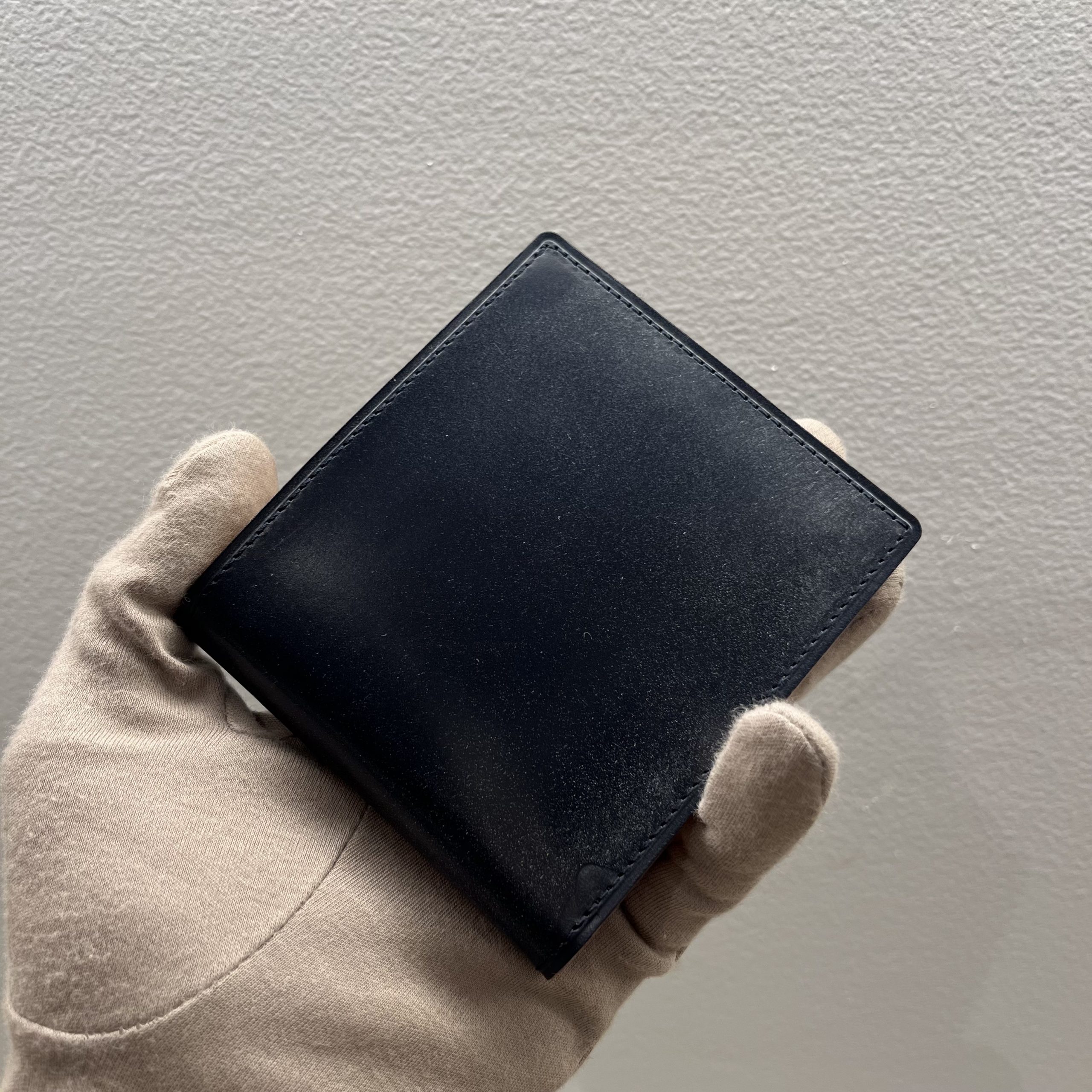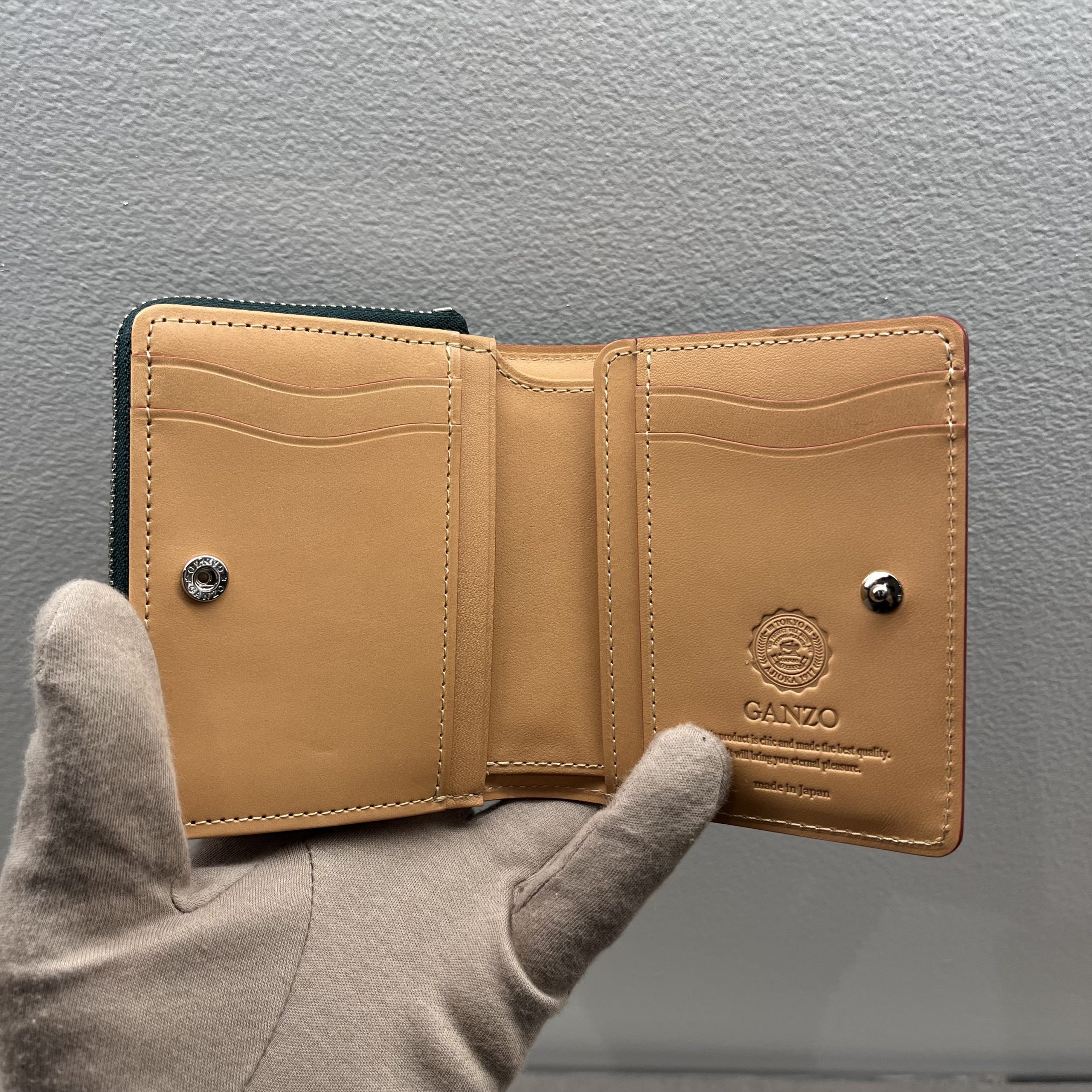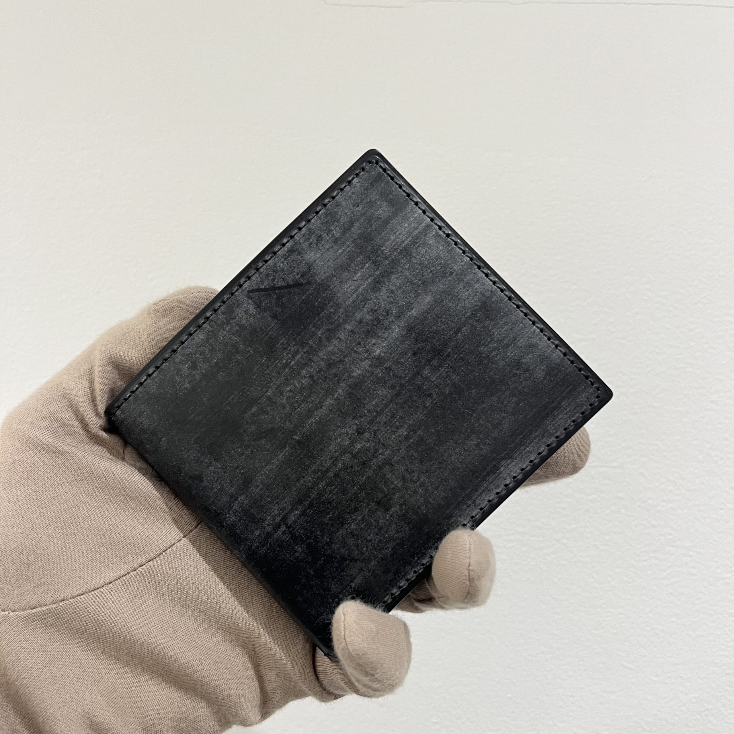 GANZOの定番二つ折り財布。贅沢に外装内装にダイドスルー(芯通し)ブライドルレザーを使用。財布の折れや曲がりにも柔軟に対応し、
