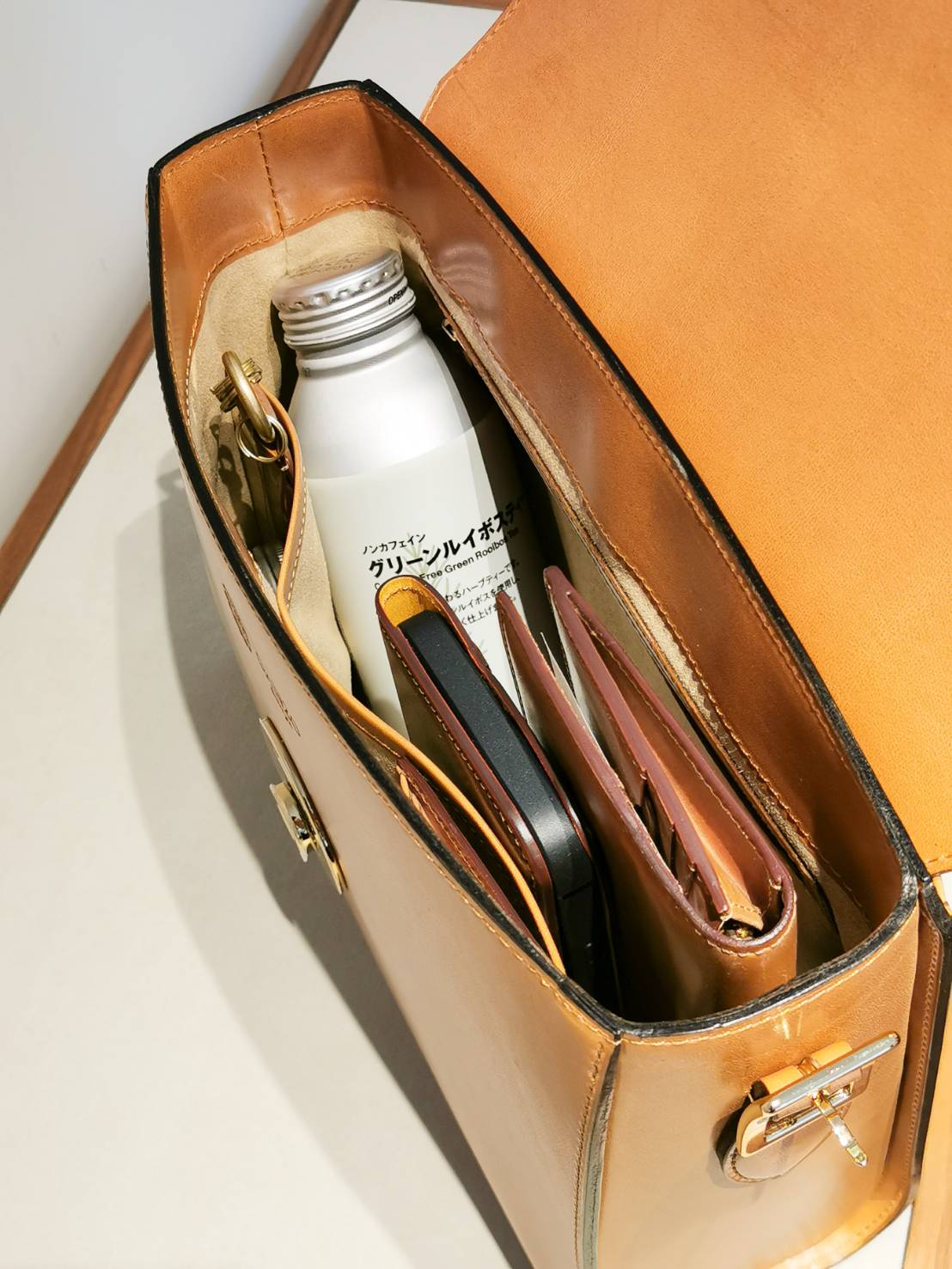 500mlのペットボトルもしっかりと入れて頂けますし、大事なお財布やキーケース、スマートフォンなども入れやすくしております。