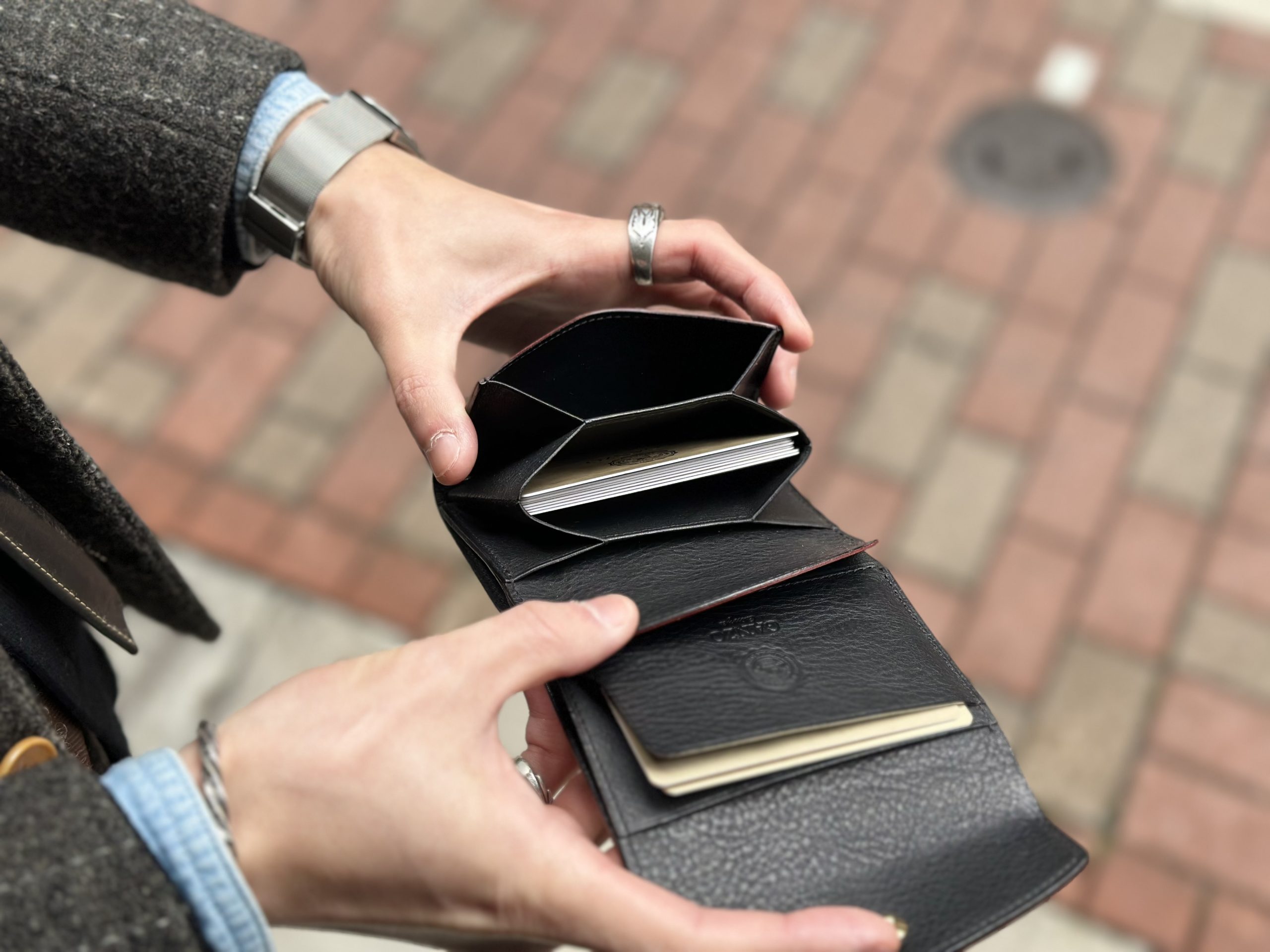 ホックをつけないことで三ッ折財布の課題である厚みを抑える事が出来ます。