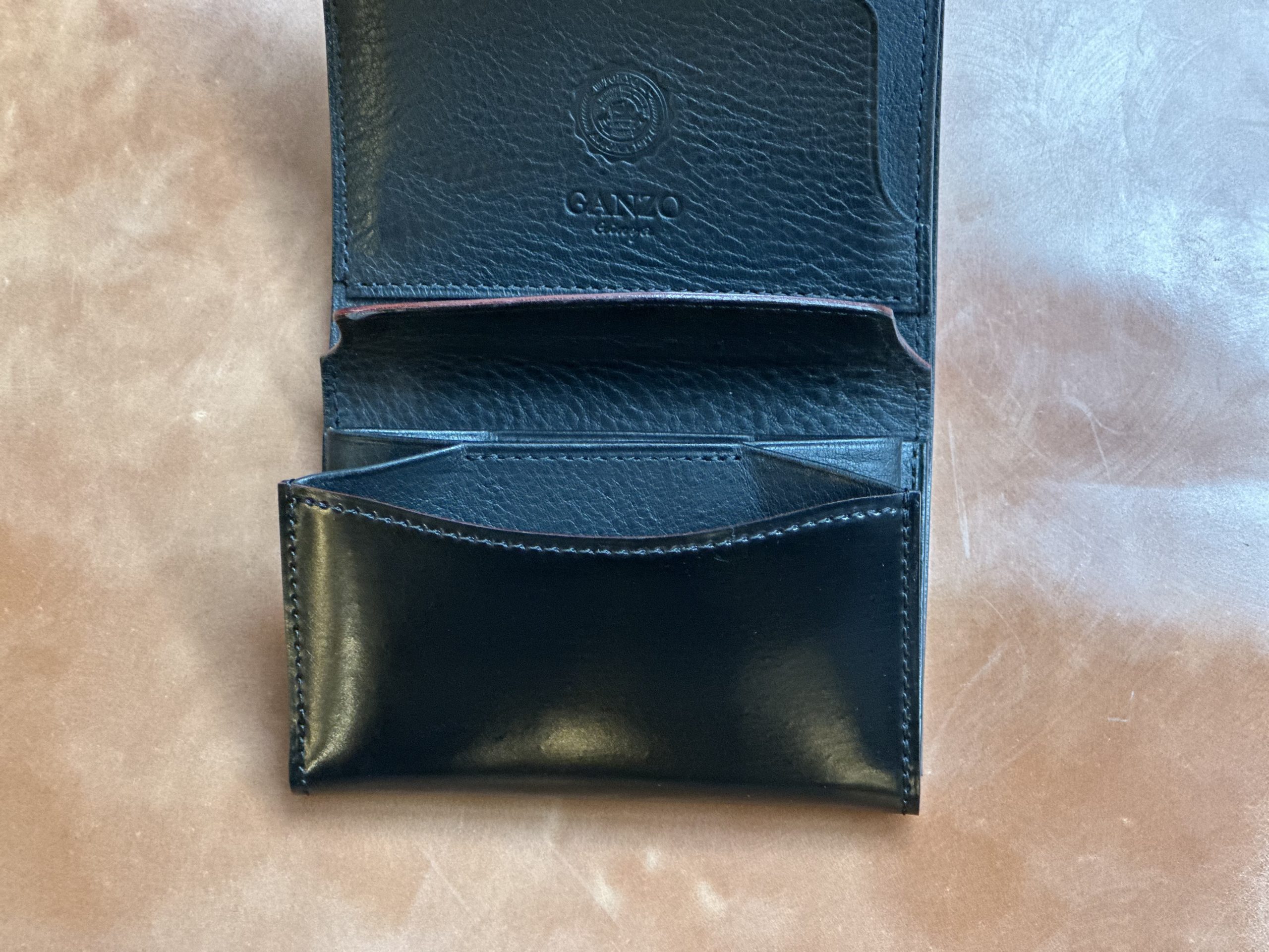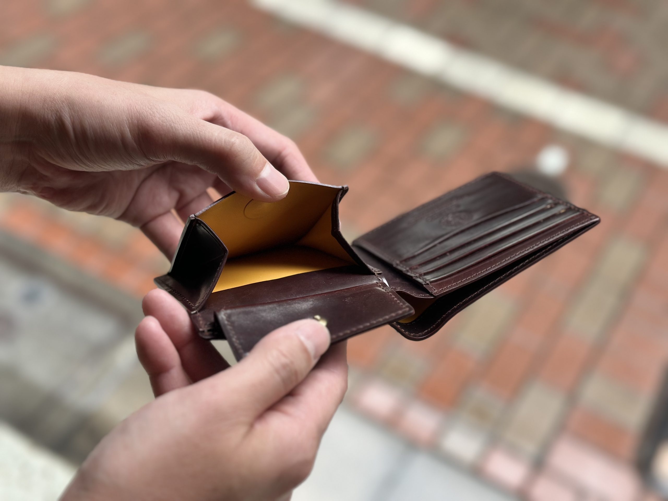 既製品二つ折りなどの小銭入のほとんどは”笹マチ”と呼ばれる、マチ部分が内側に折り込まれたものになっております。