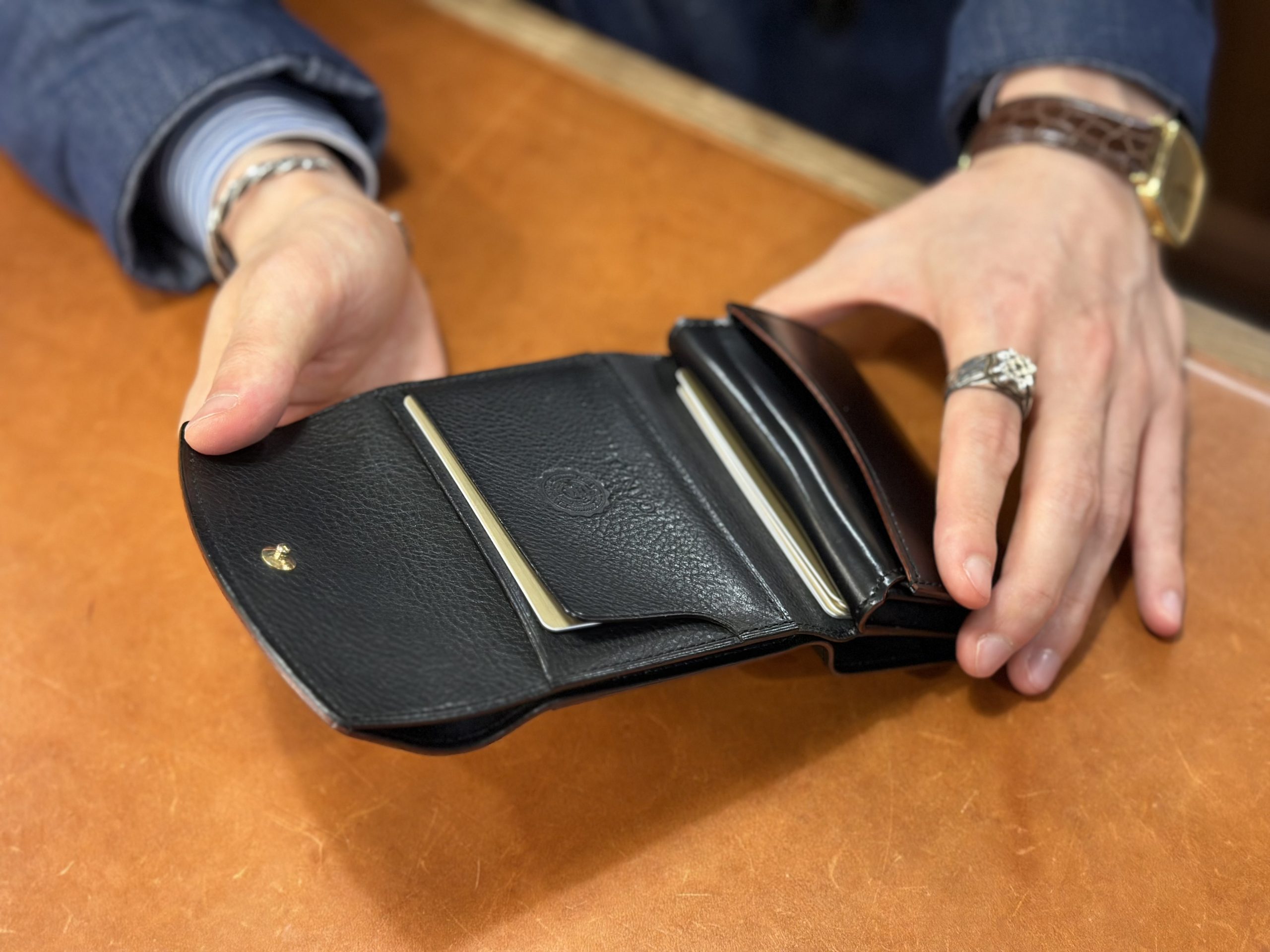 小銭入のフラップが最初にサンプルを見てから、気に入っていましたが、ホックで閉まらないことで小銭が落ちたりしないか少し不安も感じていました。