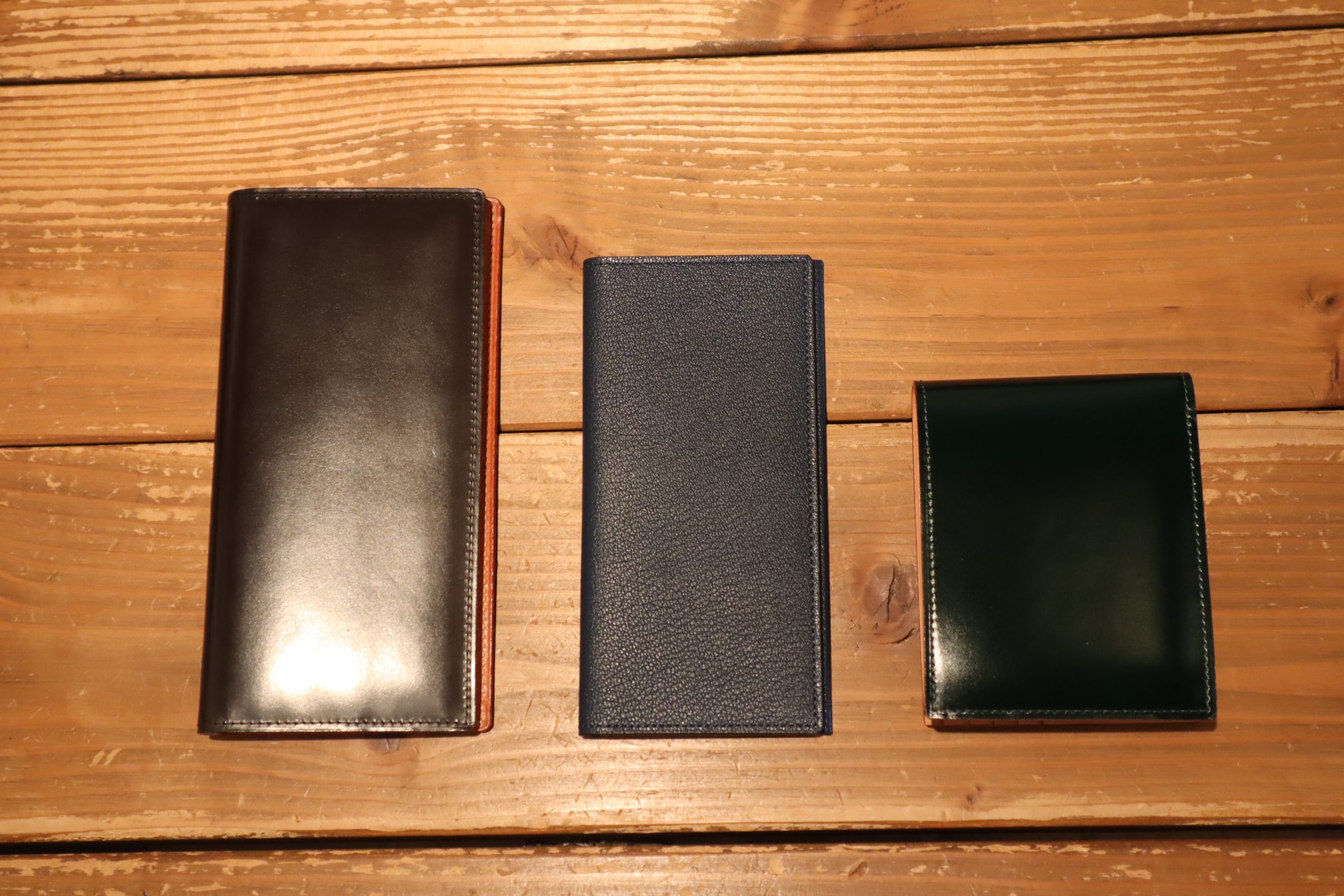 左:シンブライドル長財布 中央:エンケースウォレット 右:コードバン二つ折り財布