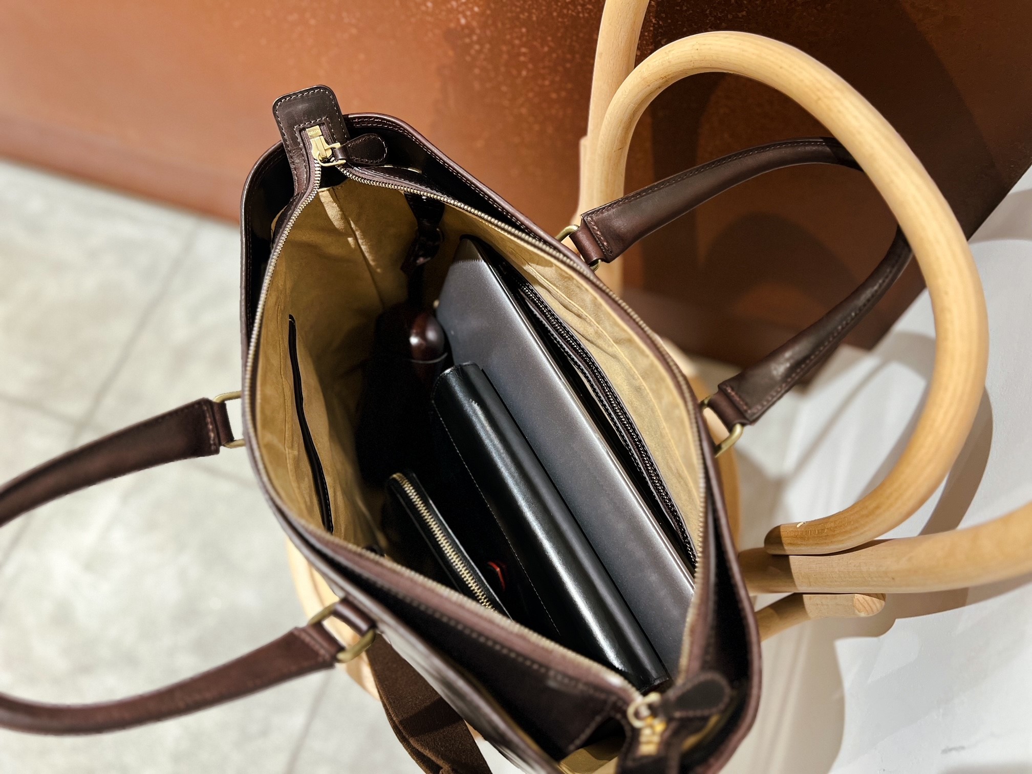 開口部のファスナーは、極上の滑らかさと輝きを持たせたYKKエクセラファスナーを採用し、内装にはやわらかな手触りの人工スエードを使用する事でバッグ全体の高級感と、軽さや汚れに対する耐性も加わっています。