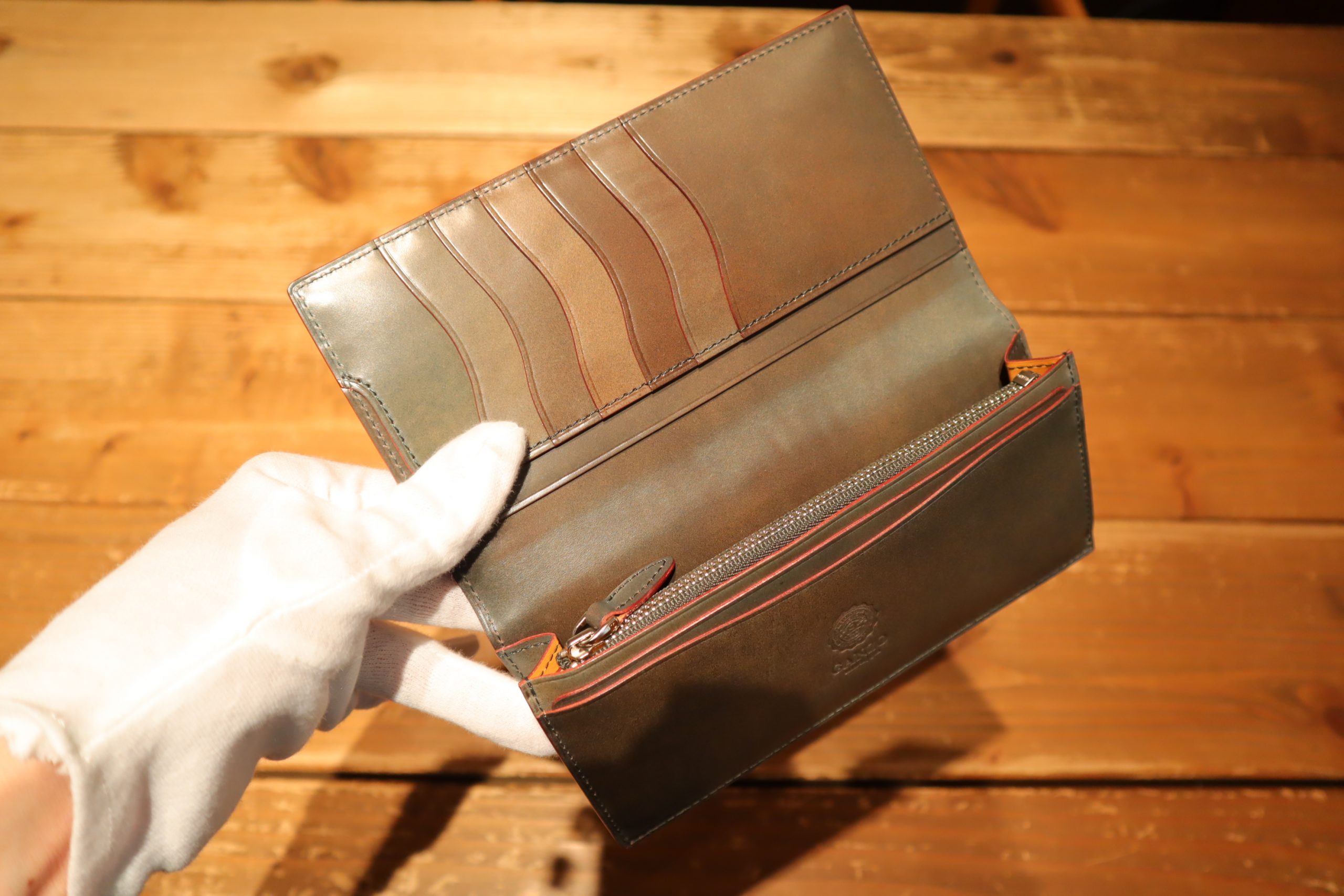 現行のアイテムにはない珍しいホワイトステッチとの組合せが実はリピーターさんの多いシリーズです。