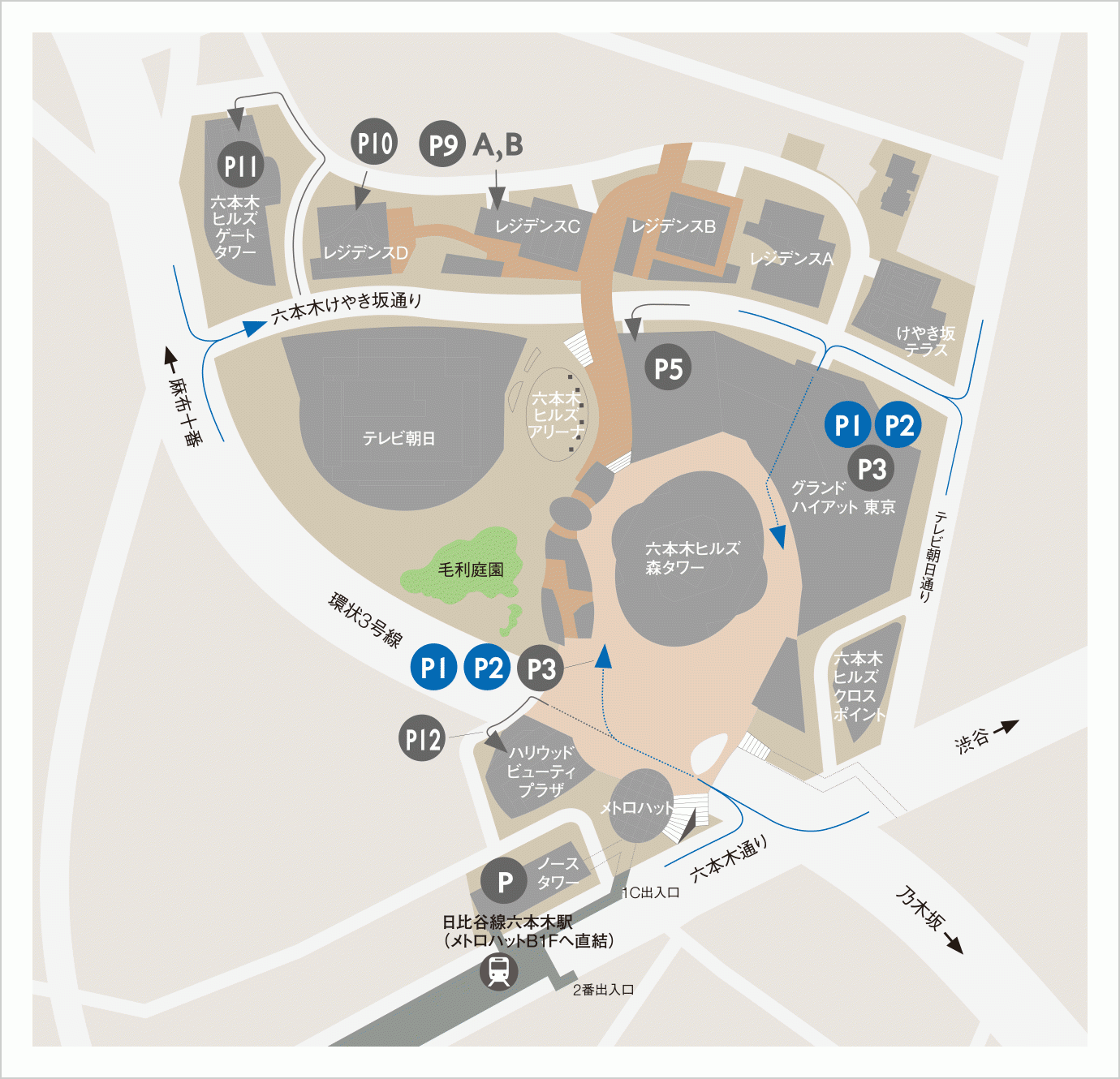 P1・P2駐車場をご利用いただくのが一番便利かと思います。
