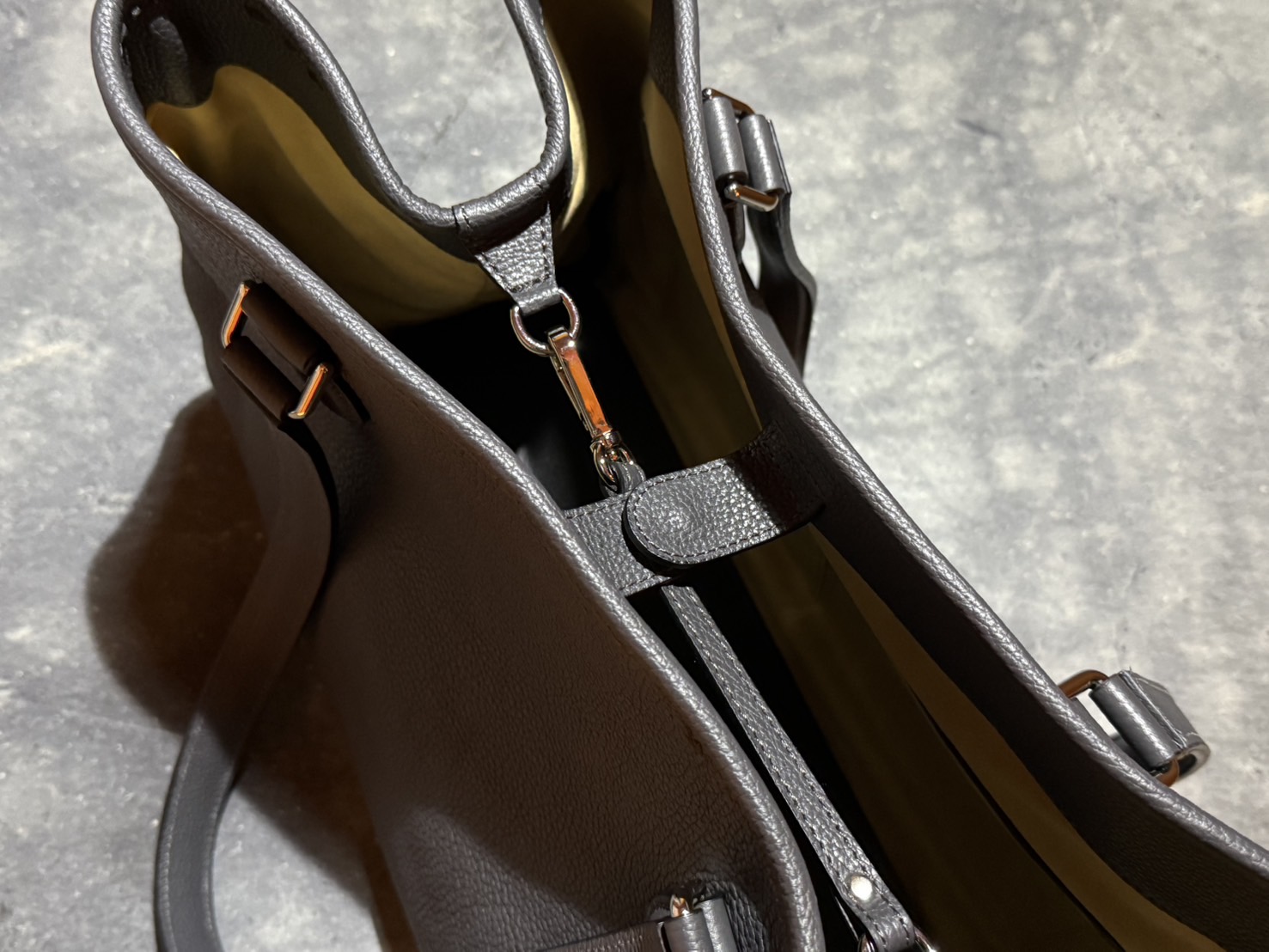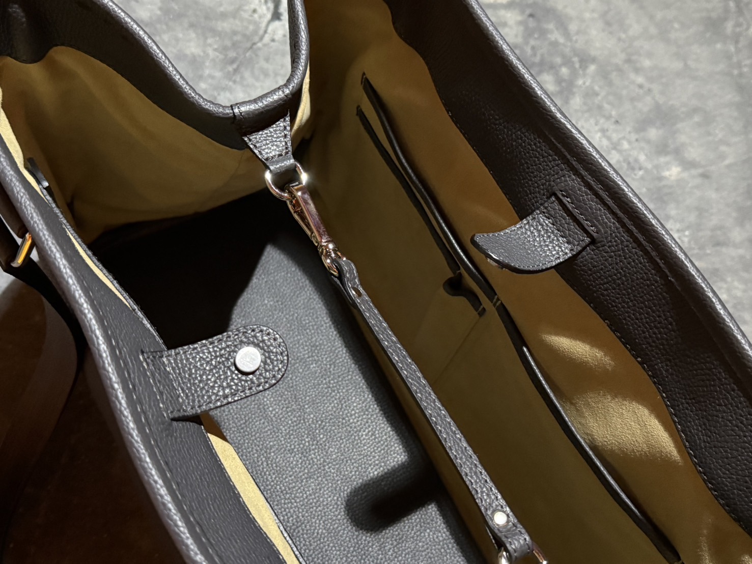 内装の浮きを抑えるため、レザーバインダーで内装を固定し、底板にもレザーを使用して上品かつ美しく仕立てた。旅行にも適した、機能性と美しさを兼ね備えたトートバッグ。