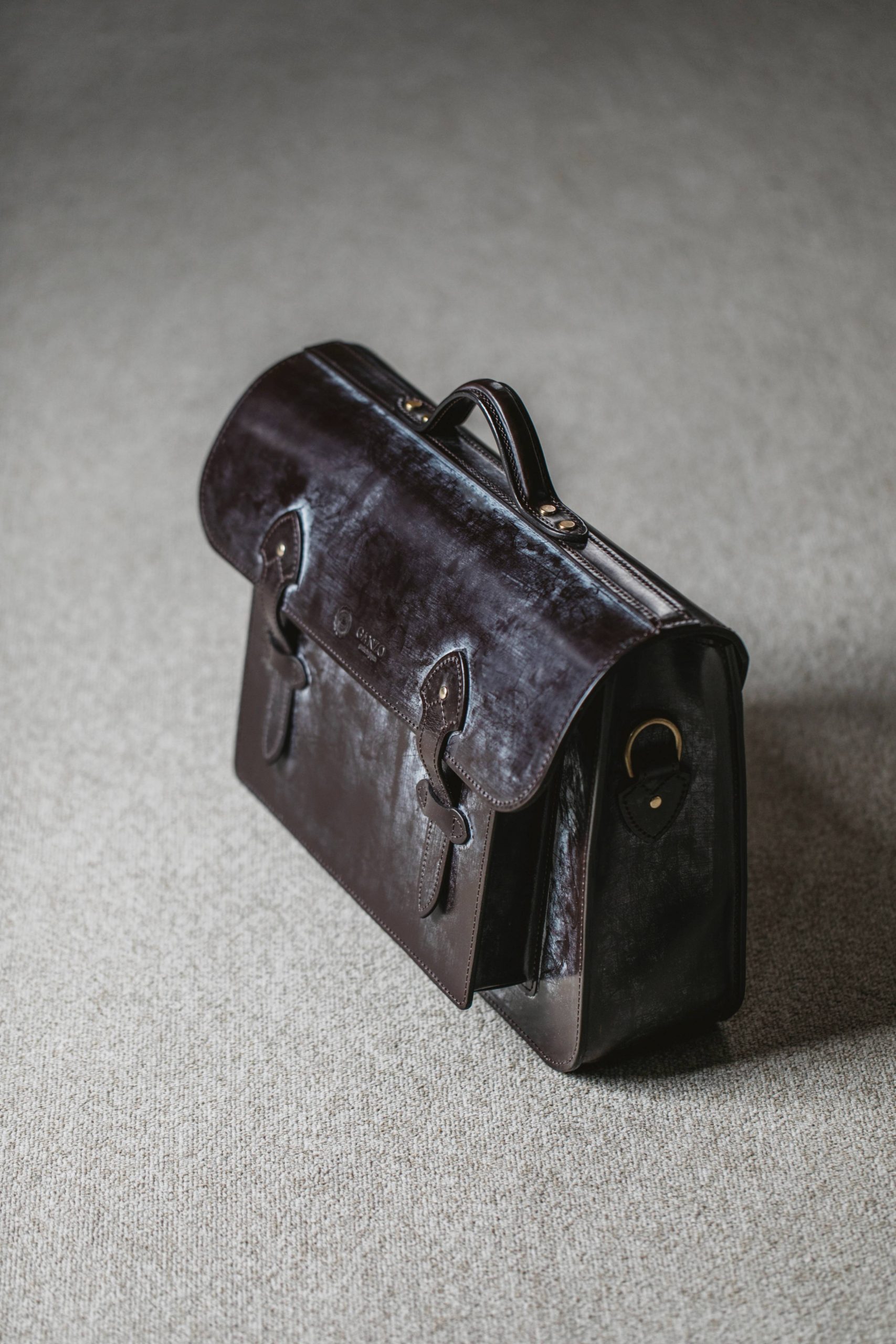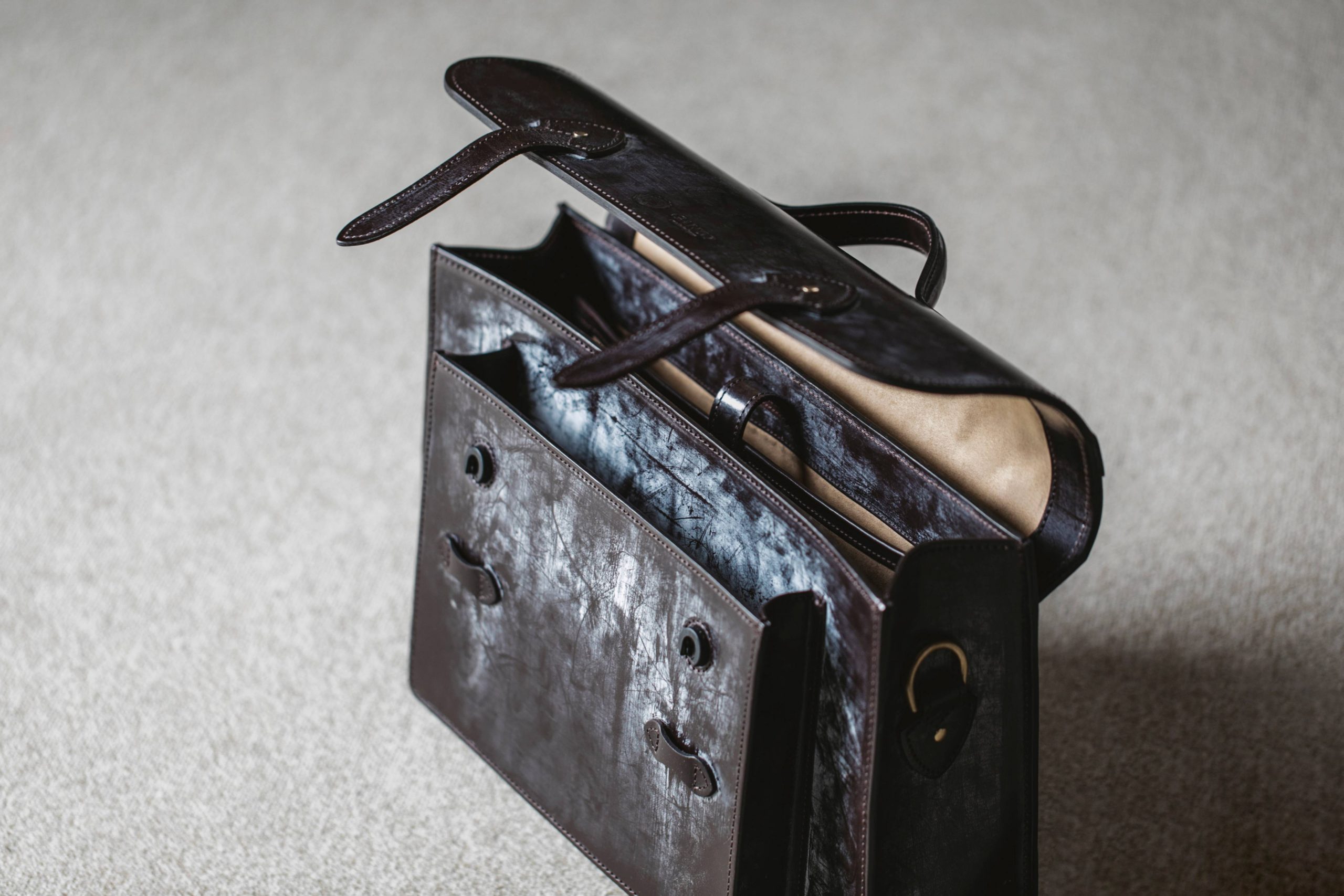 蝋引きをされているブライドルレザーは、使い込む程に蝋が馴染んでいき、艶が増していく美しいエイジングが特徴の素材。