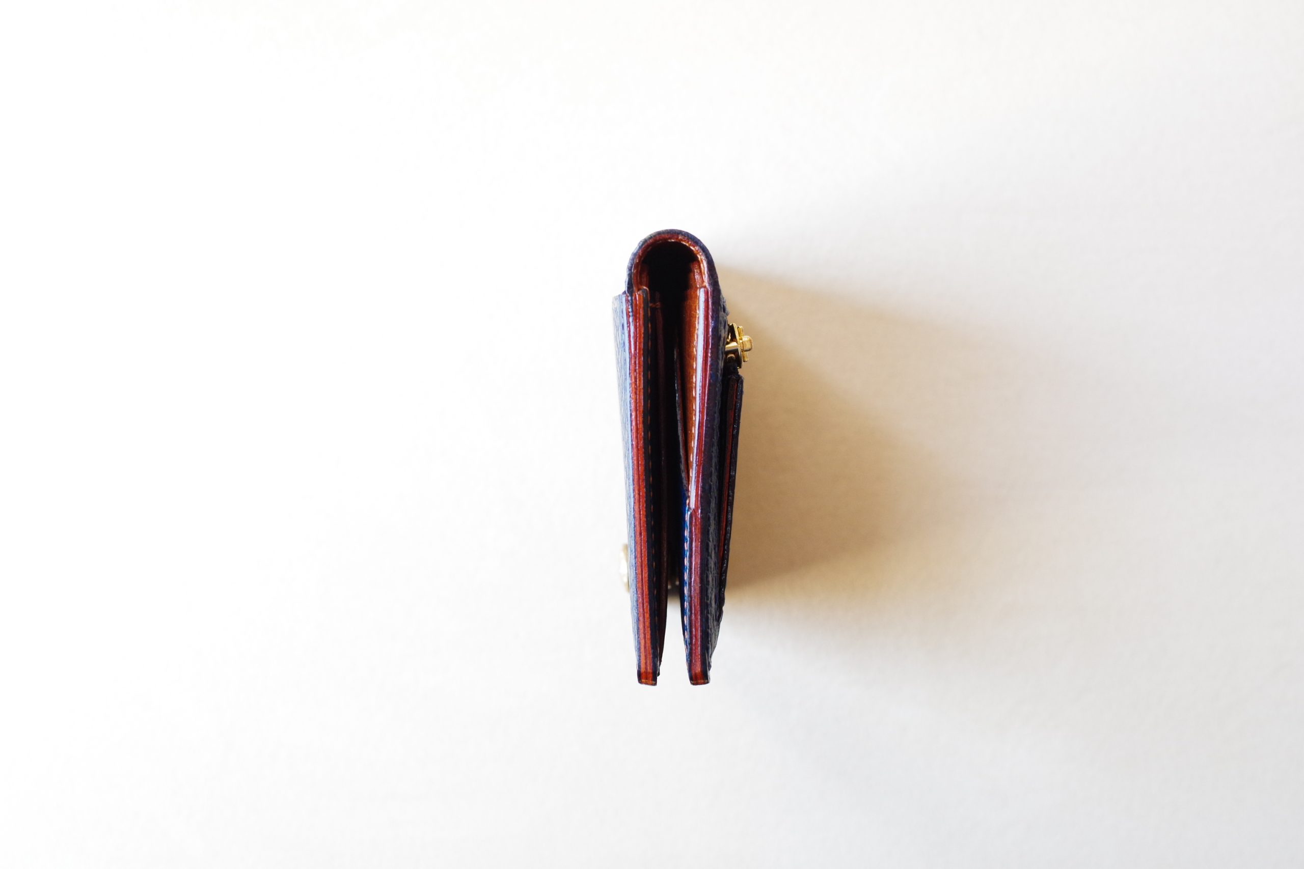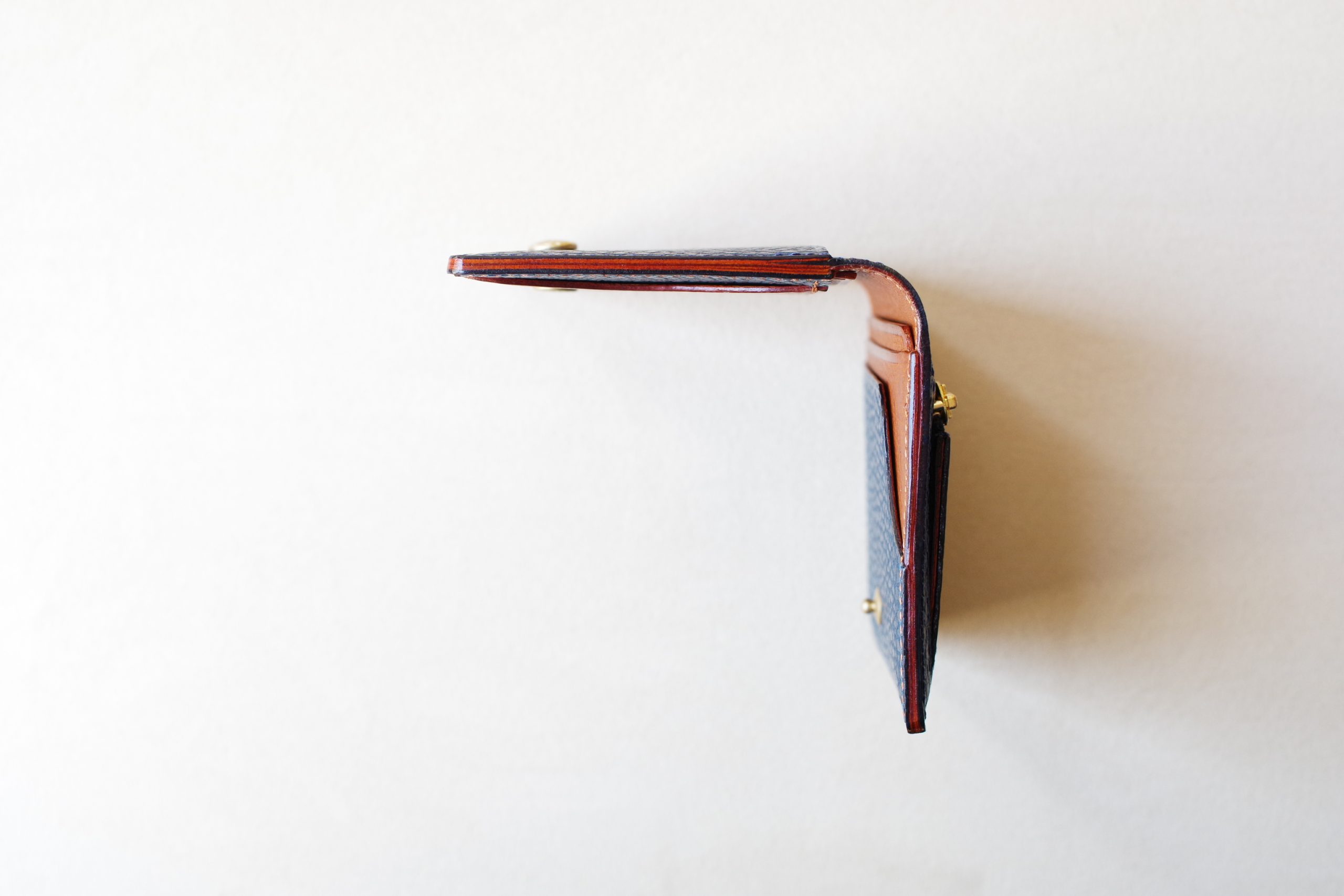 小銭入れが片マチ仕様なので、既製品のパスケースと同程度の厚みに仕上がっています。厚みは抑えていますが、ホック付きの為ホールド感もあり、型崩れの心配も少ないです。