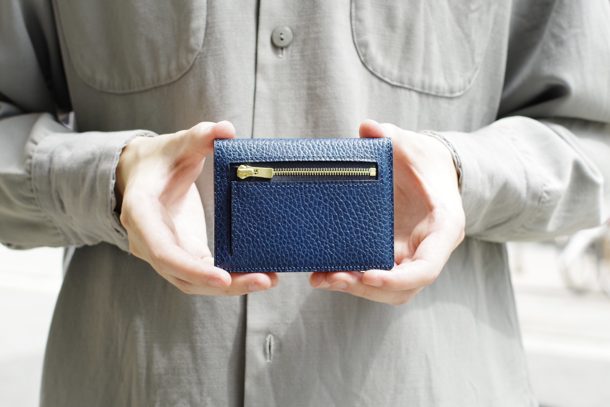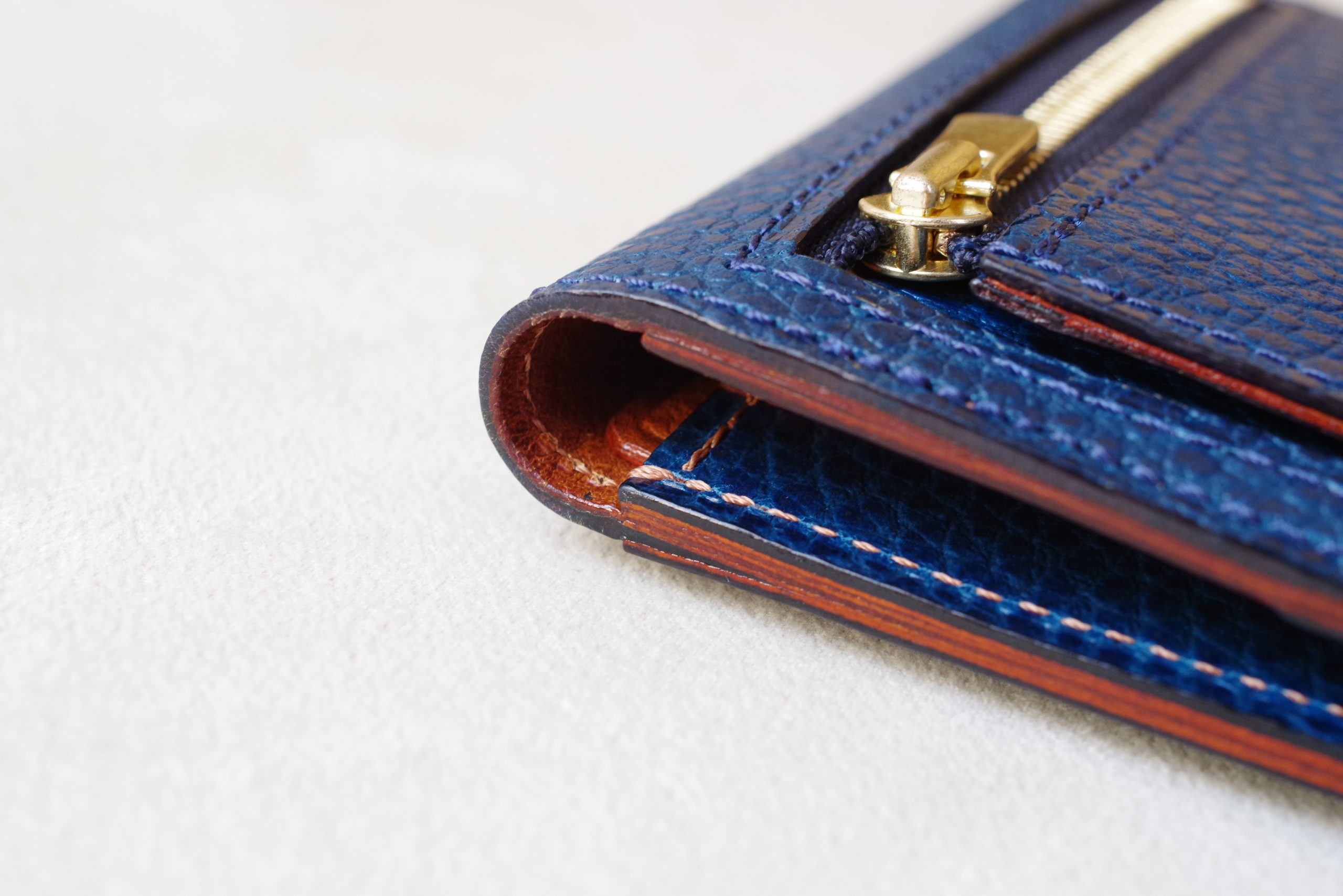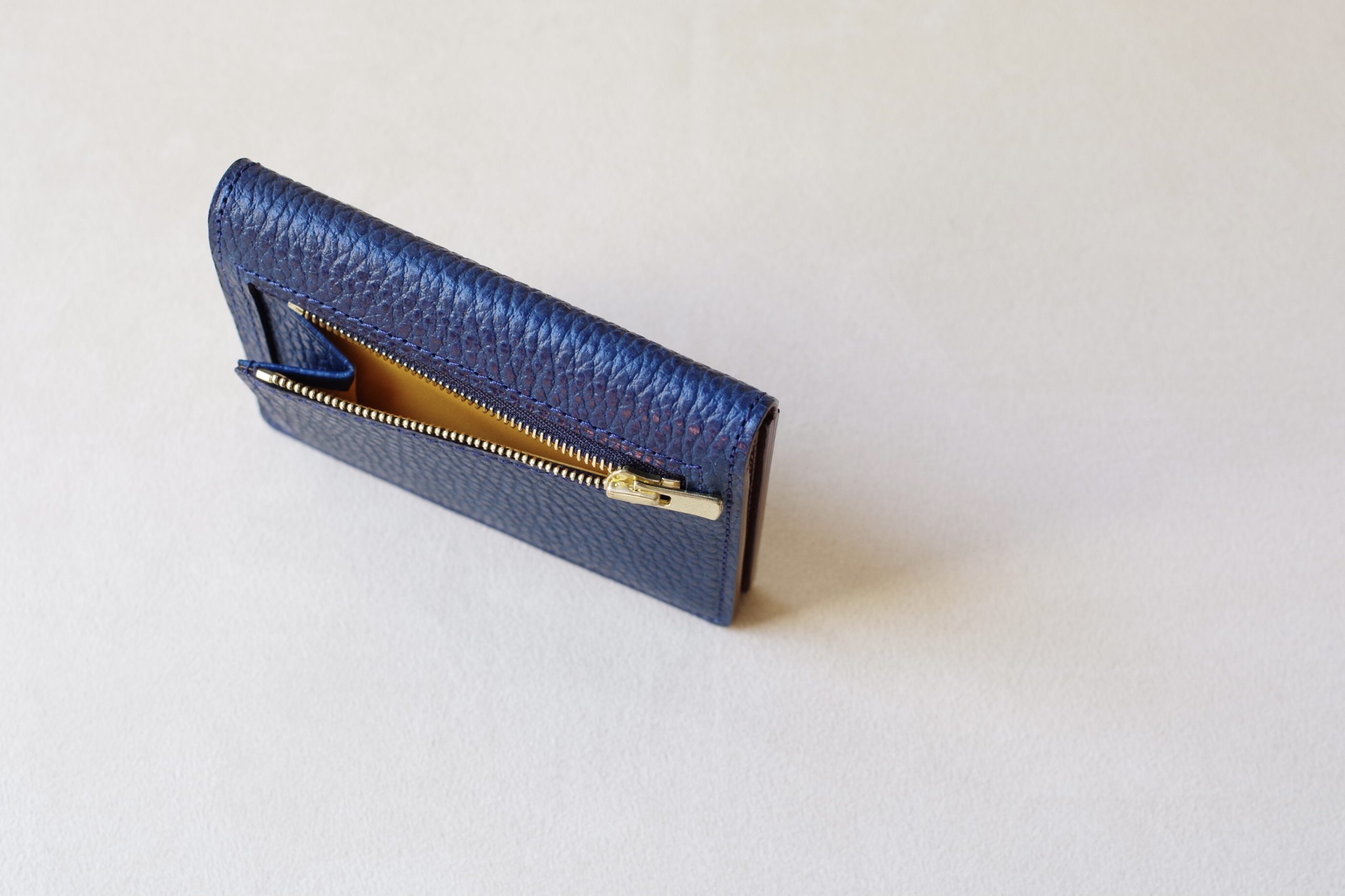 ライナー(裏張り)はドラーロ 生成りと同じくイエローを採用。コバ(断面)の色味などは既製品でも馴染みのある雰囲気に仕上がっています。ファスナーの金具部分も小さなパーツを採用しているので、ポケットに入れても邪魔になりません。
