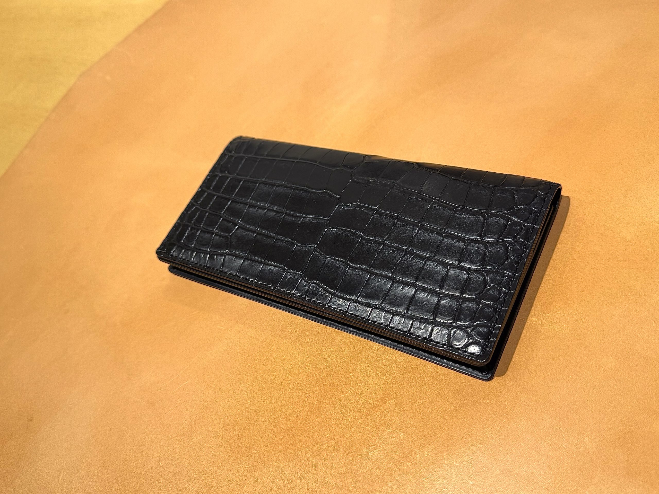 ワイド28~30cmほどの腑の綺麗なスモールクロコを使用しているため、一匹から長財布がひとつしか作れない他のクロコにはない繊細な腑の並びと、クロコならではの頑強さを兼ねそろえています。