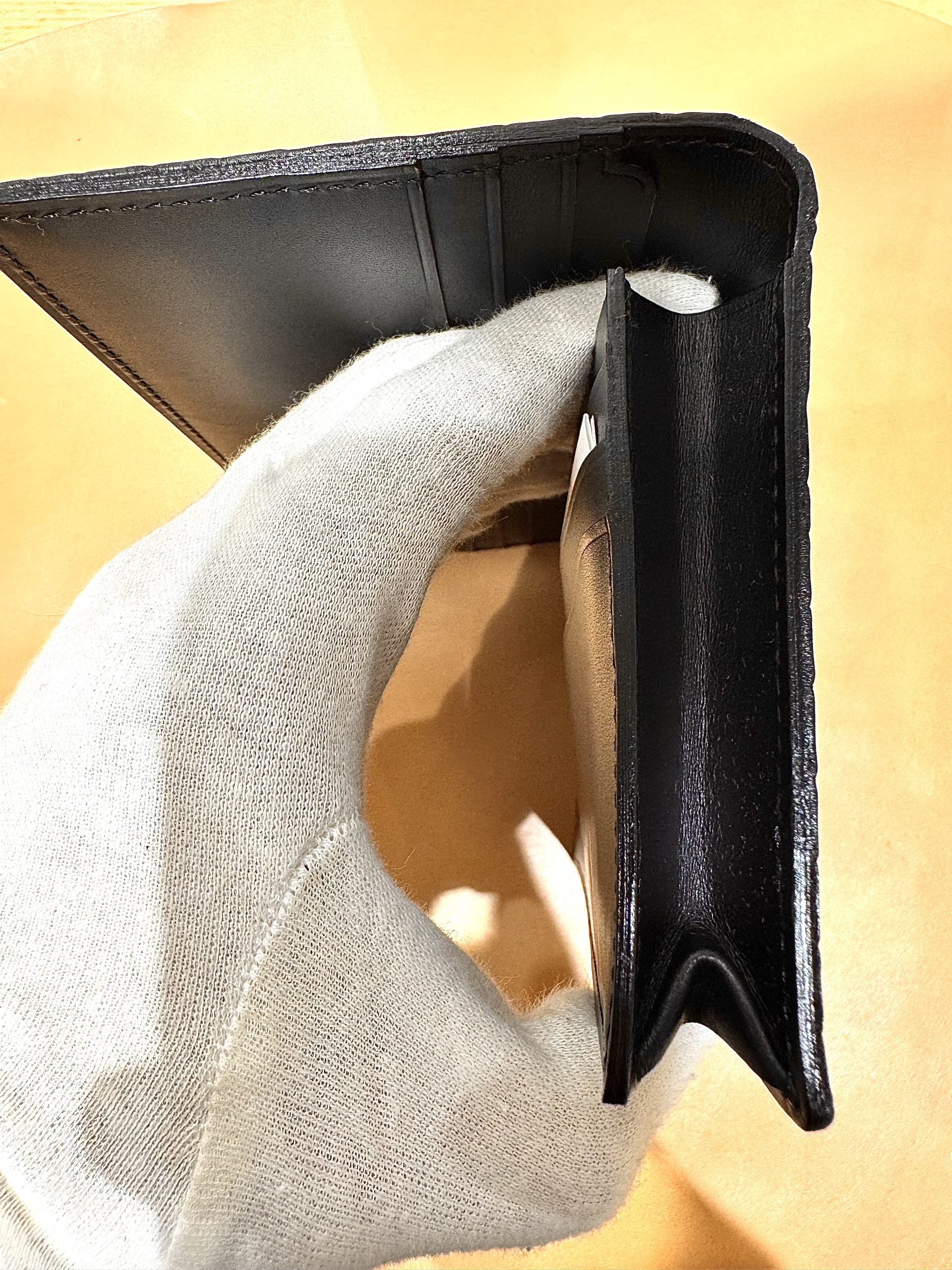 カード段は美しく念引きされた職人技の見せ所に加え、カード類の重なりを考えられ配置されているため、綺麗に収納出来る。使用しているクロコは数あるクロコの中でも最高品質のスモールクロコ。