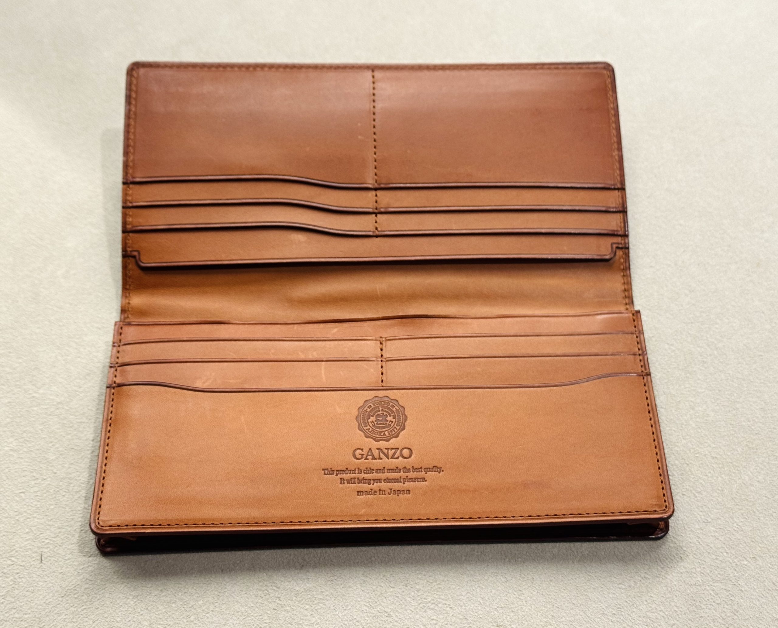 新札で100枚収納出来る通しマチ、お札が折れずに真っすぐ100枚収納が可能。カード段は美しく念引きされた職人技の見せ所に加え、