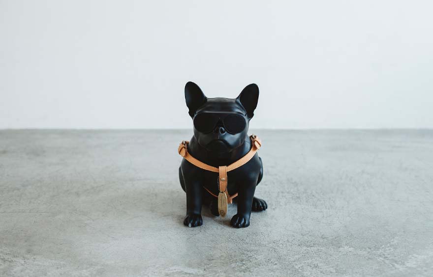 フランス「MusicLife」社から届いたのは、「エアロブル」と名付けられたフレンチブルドッグ型のスピーカー。遊び心あふれるアイテムに、ミネルバボックスのレザー製のハーネスをつけた。経年変化がよく表れるだけに、スピーカーも長く使いたくなる。