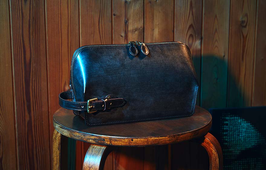 近年、メンズファッションの世界で浸透が進んだのがクラッチバッグだ。素材は英国の老舗タンナー「J&E セジュイック社」のブライドルレザーを使っている。頑強な素材ゆえ、成形には高い技術力が求められるが、その課題をクリア。立体的な成形を実現した。これまでのクラッチバッグ像を更新するビジュアルだ。
