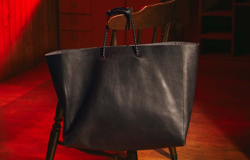 イタリア語で「紙袋」を意味する「Sacchetto(サケット)」シリーズは、その名に違わない軽さが魅力だ。これが実現できたのは、バッグ本体を1枚革で仕上げているから。薄くて、軽い素材なので、使わない時はくるっと丸めてしまっておくこともできる。