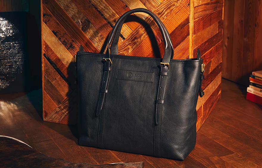 GAZNO独自開発のレザーが「7QS-H」だ。丹念に飼育管理された黒毛和種・飛騨牛のレザーに対し、「素材」「裁断」「すき」「縫製」「へり返し」「磨き」「仕上げ」という7工程を突きつめた。GANZOのクラフトマンシップに対する思想がこめられている。今回は、このレザーを使ってトートバッグを制作。タンニンなめしを内部に浸透させるため半年以上も寝かせた素材は、厚みを維持したまましっとりと柔らかく仕上がった。
