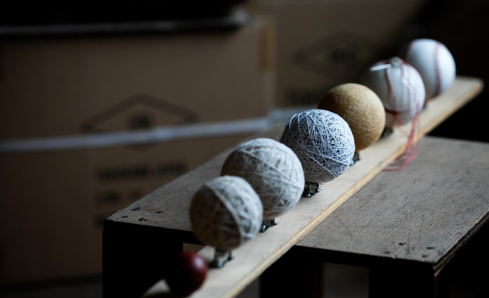 糸は3回に分けて巻かれていきます。まずは芯に太いウールを巻くところから始まります。そうすることで2つ目のウールを巻き進めていく中で核となる芯が正しく中心を保てるようになるのです。そして最後に綿糸を巻くことでボールの表面の凹凸をなくしていきます。重いウールを使えば重さ規定に沿うようにややふわりと巻かれ、柔らかくて軽いウールを使えば硬く頑丈に巻く。それはボールの飛距離にも影響し、硬く頑丈に巻かれたボールはよりよく飛ぶボールになるのです。