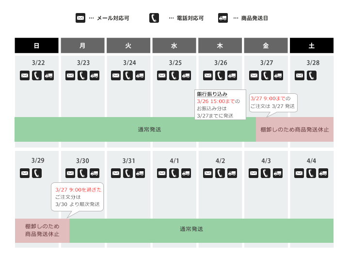 3/26(木) 15:00 を過ぎたお振込み → 3/30 以降 順次発送